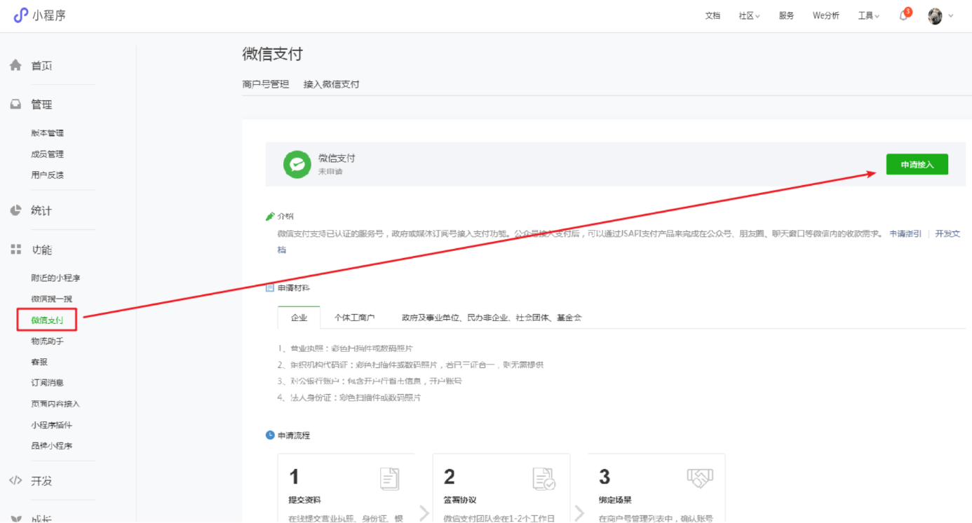 ① 在小程序管理后台【微信支付-支付申请】中点击【申请接入】,然后根据提示完成注册即可。