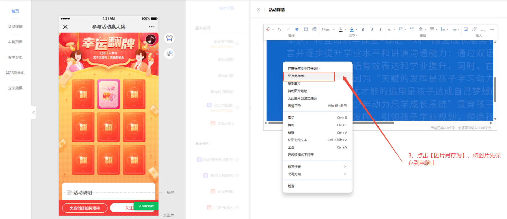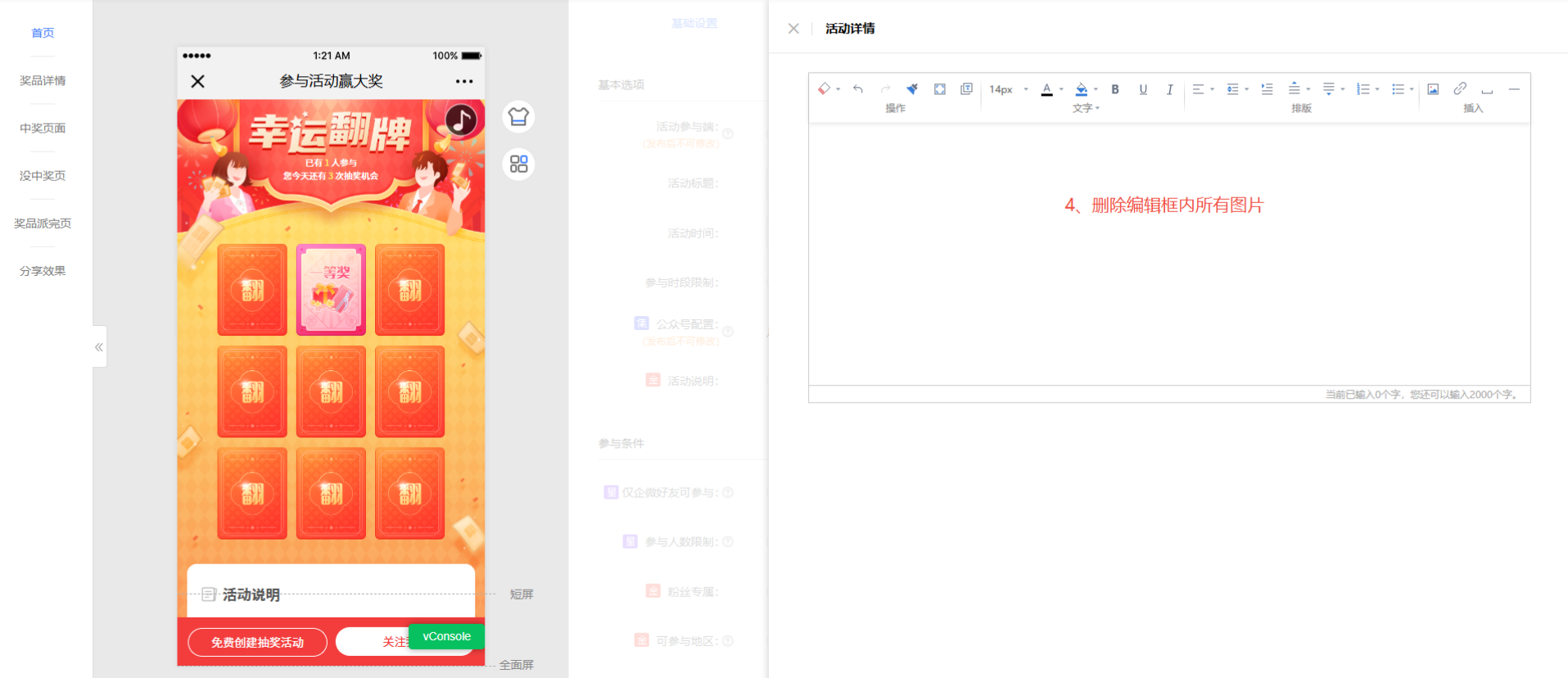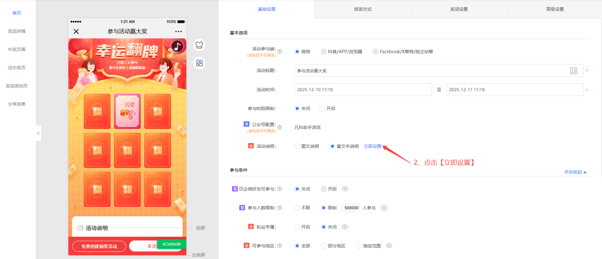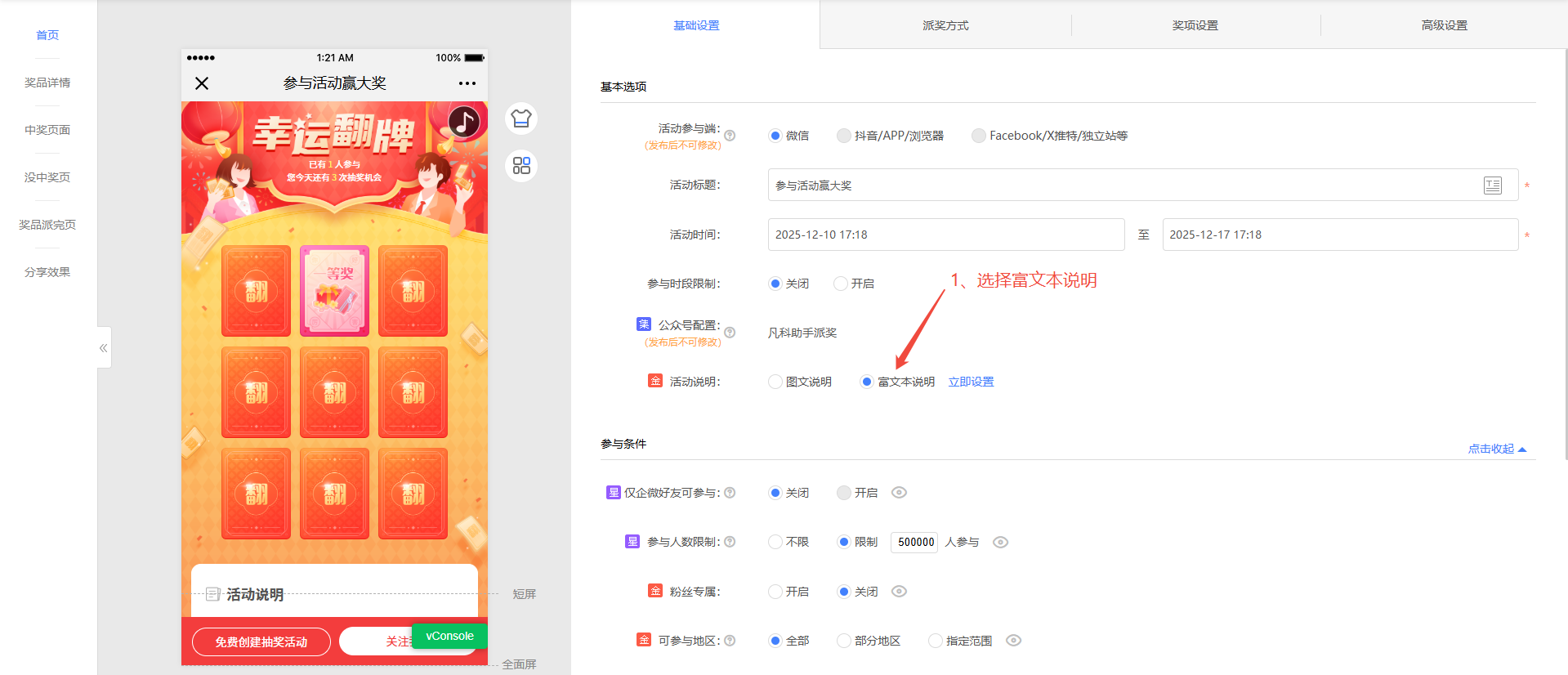 1、 在活动编辑页面【基础设置】->【基本选项】->【活动说明】->选中【富文本说明】