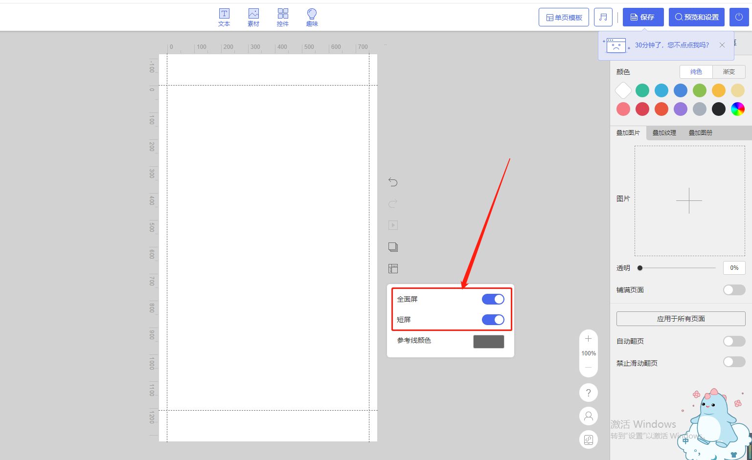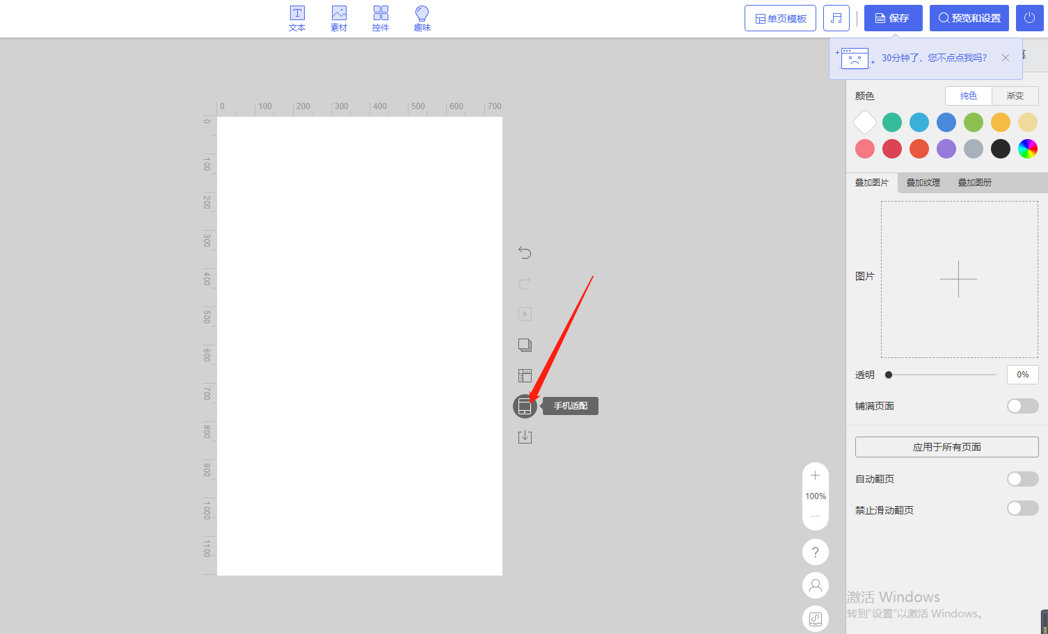 A:微传单不是自适应的,一般建议上传适合标准屏:750*1206px的尺寸图片素材;上传后开启【手机适配】功能,开启后,虚线外的页面使用背景颜色填充,内容和图片放置在虚线内,可实现不同手机屏都可观看完整内容;否则虚线外的部分,部分手机观看内容就会出现遮挡缺失的可能