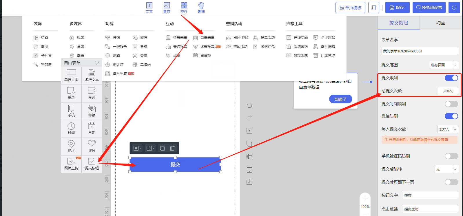 试用版本最多支持提交200次,超出会提示已达上限;如已购买付费版本,检查是否提交按钮有设置对应提交次数限制,关闭限制或修改限制次数即可