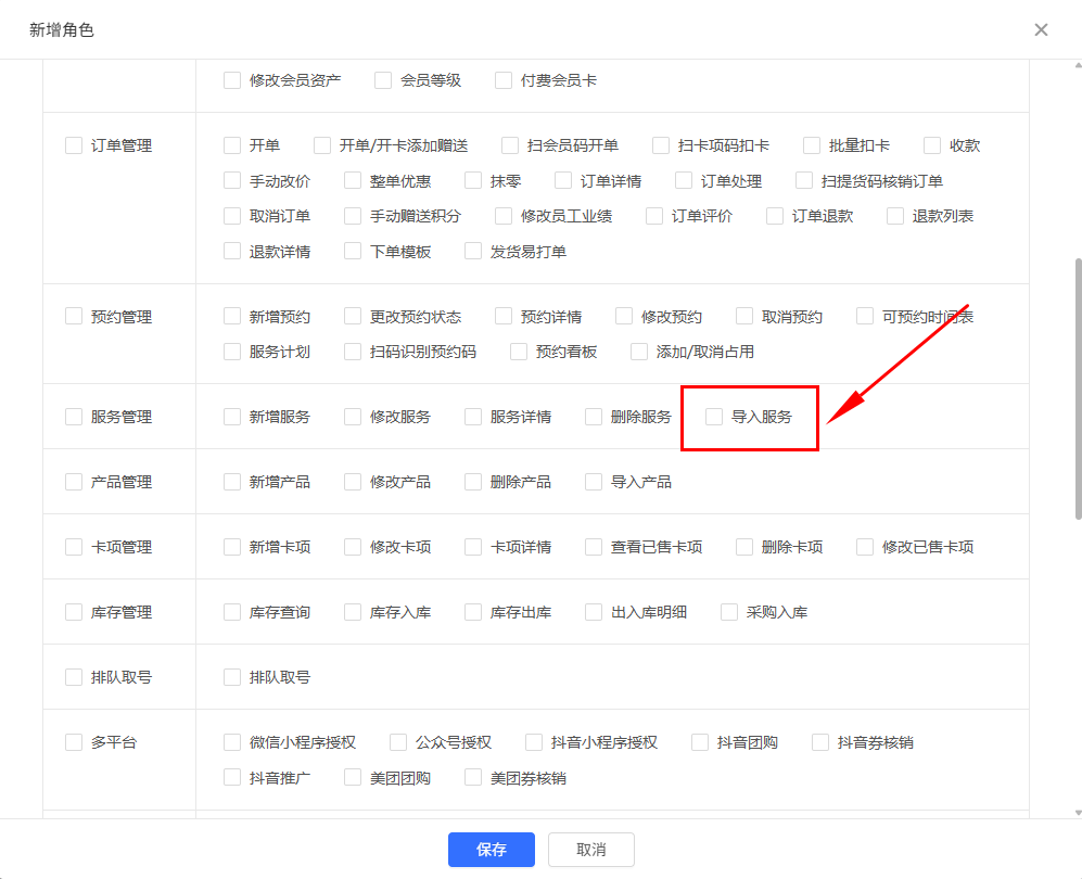 1、服务管理中新增“导入服务”子权限(注意:多店版仅总部角色权限显示)