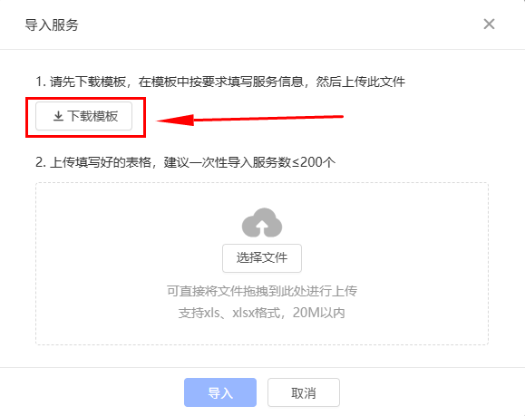 3、点击【下载模板】可下载服务导入模板