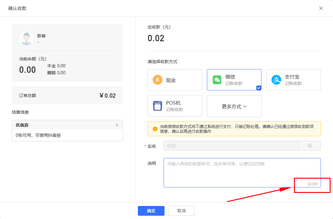 【功能举例】开单收银收款说明备注字数优化至 200 字,PC、安卓、商家端小程序全端适配,可详细填写消费明细、服务备注、优惠说明等各类收款相关信息,告别原数字数受限问题。