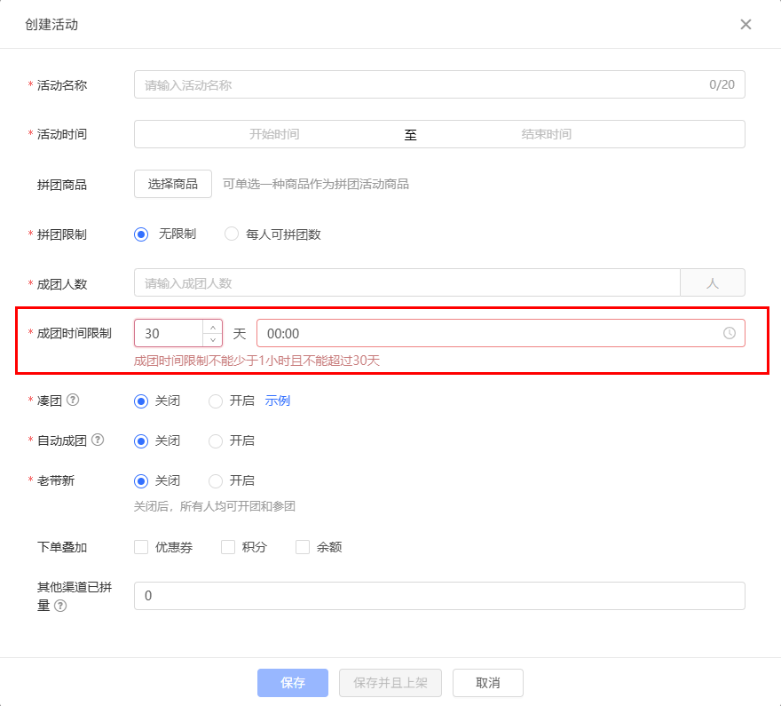 拼团成团时间限制放开至30天,成团时间限制改成不能少于1小时1且不能超过30天。