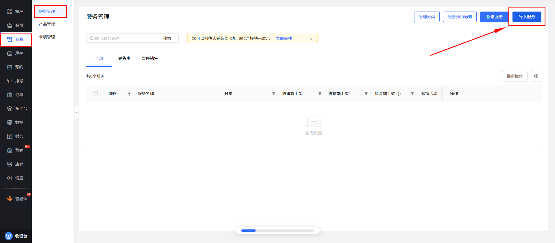 2、服务管理新增“导入服务”操作(注:多店版时仅总部视图-总部服务显示)