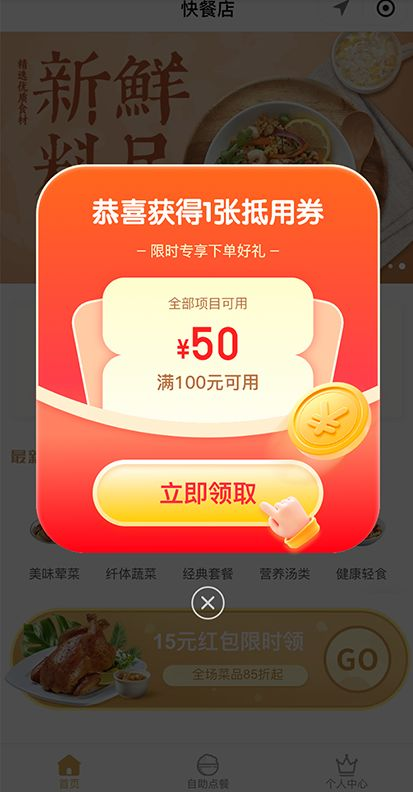 【功能举例】支持在门店小程序首页、结算页、支付后等关键场景,自动展示弹窗、悬浮等形式的营销广告,商家后台简单配置,即可实现新品、活动、优惠券等内容的自动化推送。