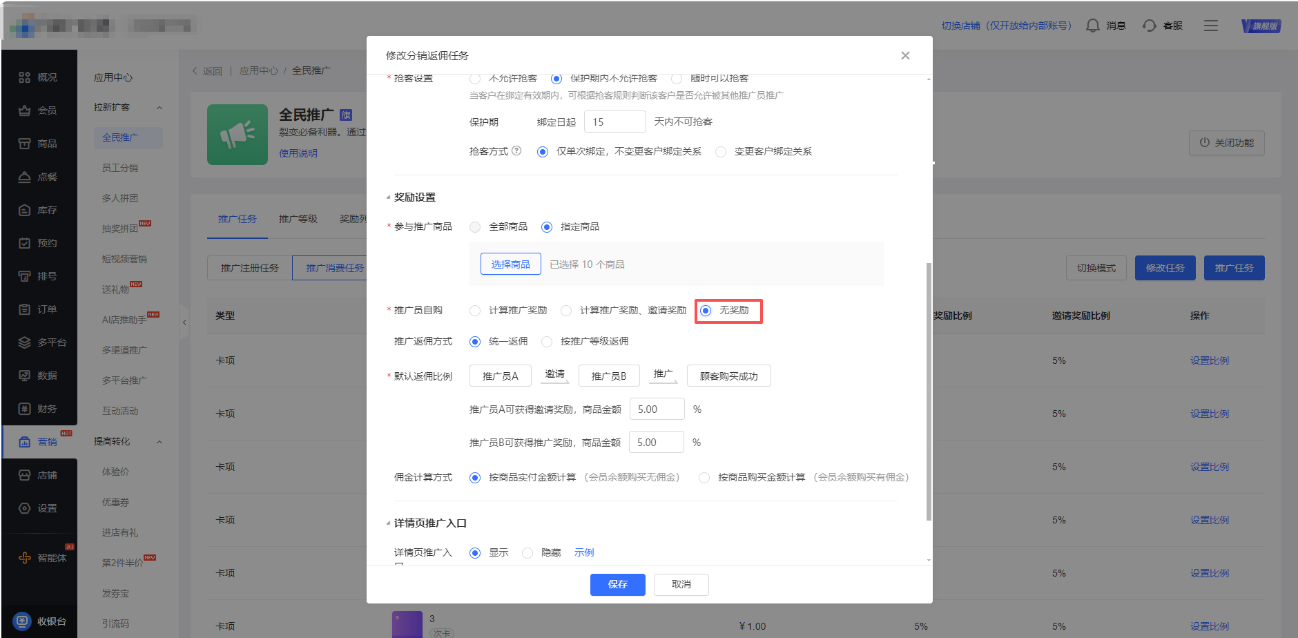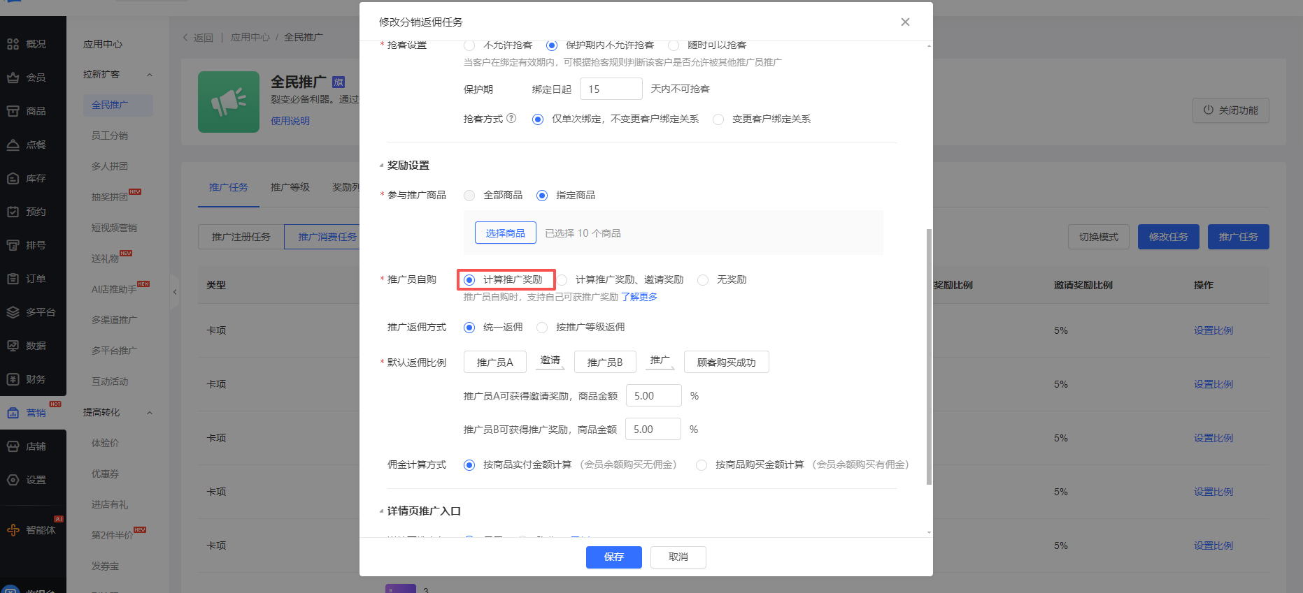 3. 推广员自购:设置为“计算推广奖励、邀请奖励”