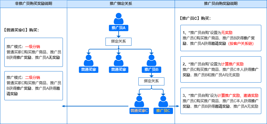 按“推广员关系链”核算,即推广员本人购买商品,自己获得推广奖励,上级能获得邀请奖励。