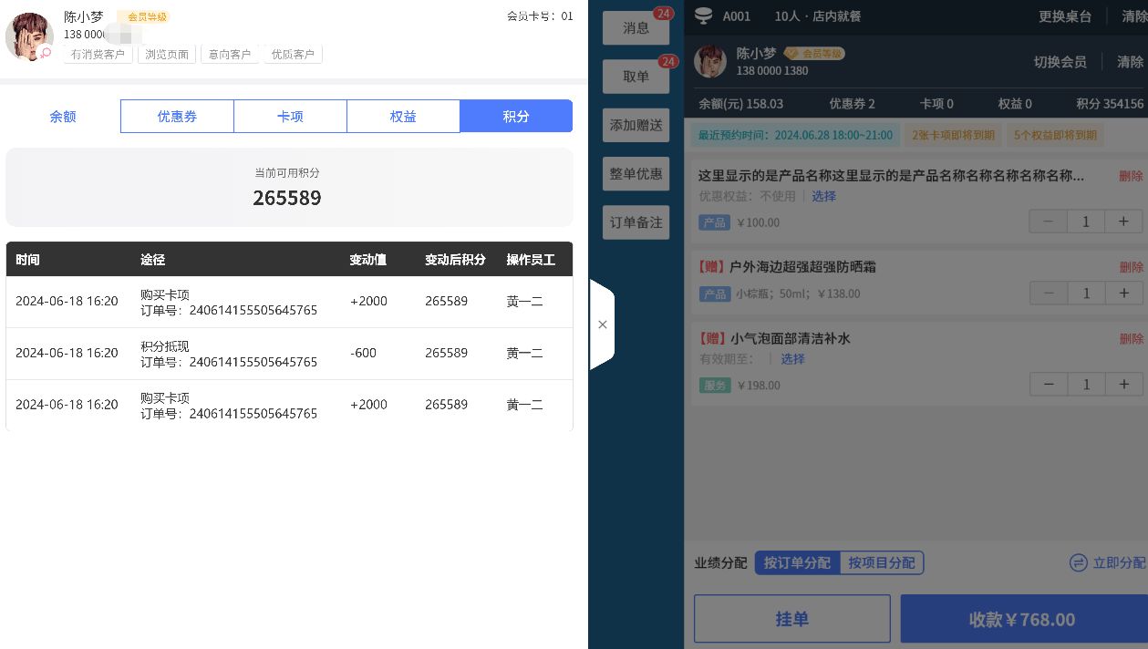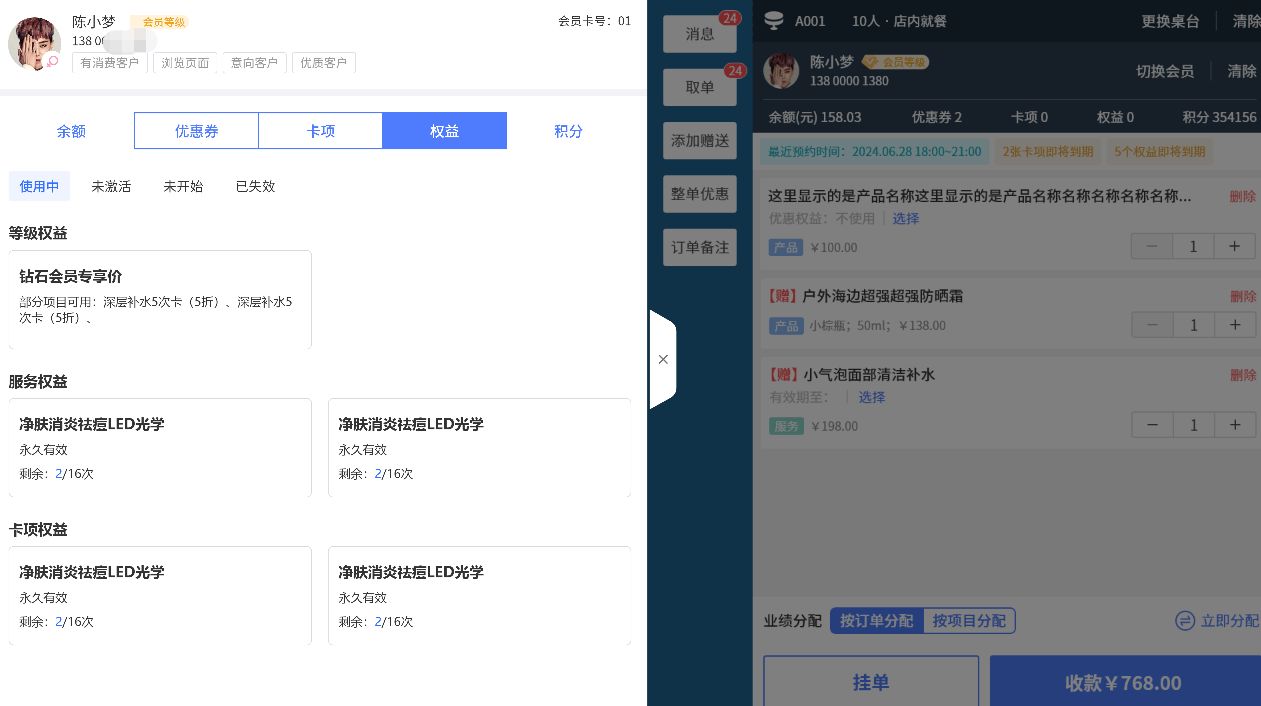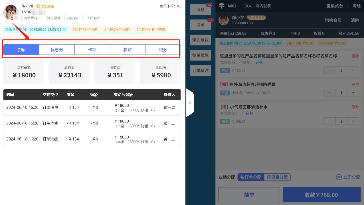添加会员后,可在收银台直观查看该会员的资产信息,具体包括:余额、优惠券、卡项、权益、积分信息