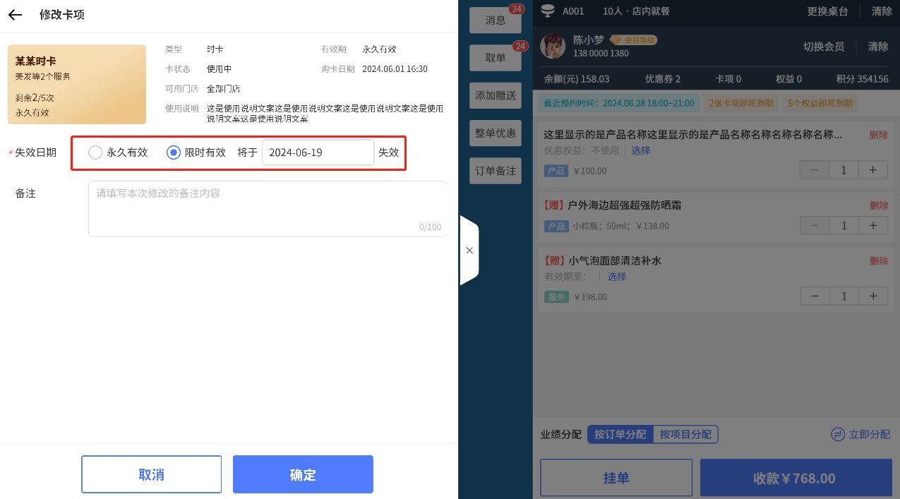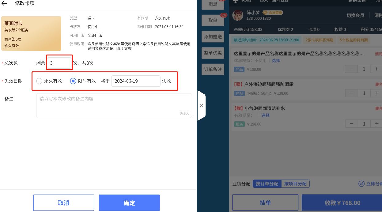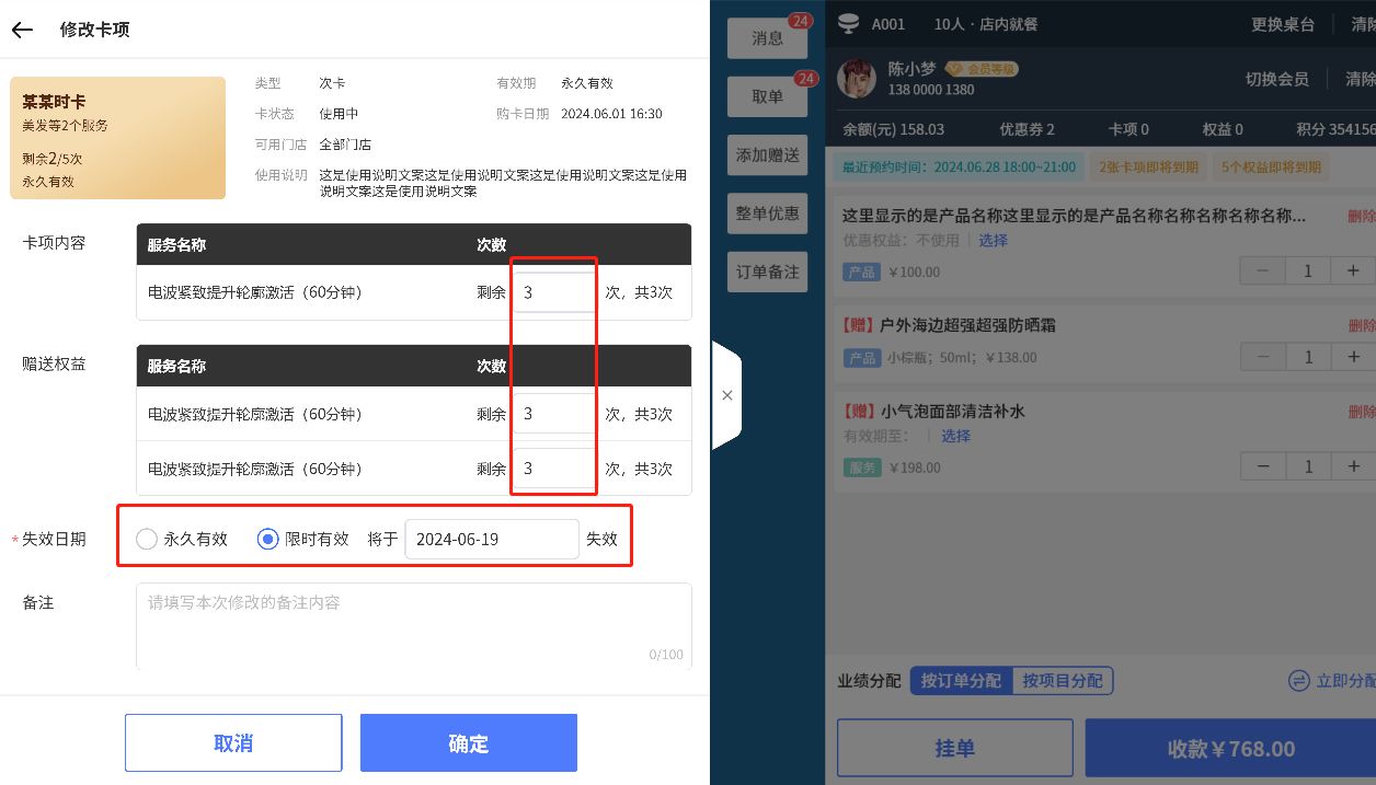卡项修改范围包括:次卡、通卡、时卡的次数或有效期限