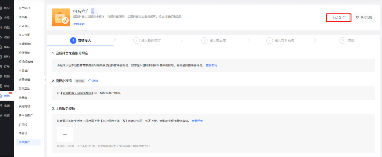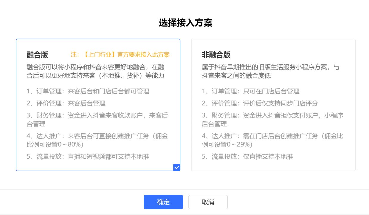 门店系统抖音推广功能现已支持接入融合版,融合版可以将小程序和抖音来客更好地融合,在融合后可以更好地支持来客(本地推、货补)等能力