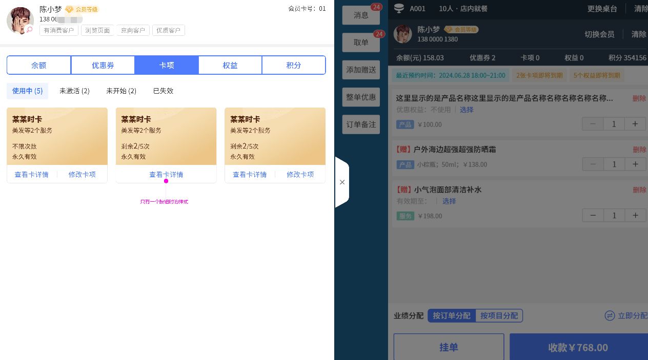 收银台可以直观查看会员的资产信息,帮助商家快速了解客户的消费情况,进而提供更合理的产品和服务推荐,从而促进消费。同时,商家可根据情况修改客户卡项,方便门店人员更便捷得管理和调整会员资产