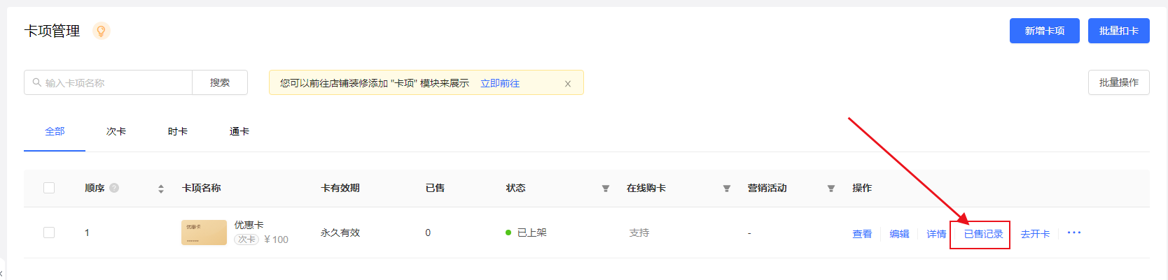 在【会员--会员列表】中,点击查看【已售记录】,可以查看会员的已购卡项内容。