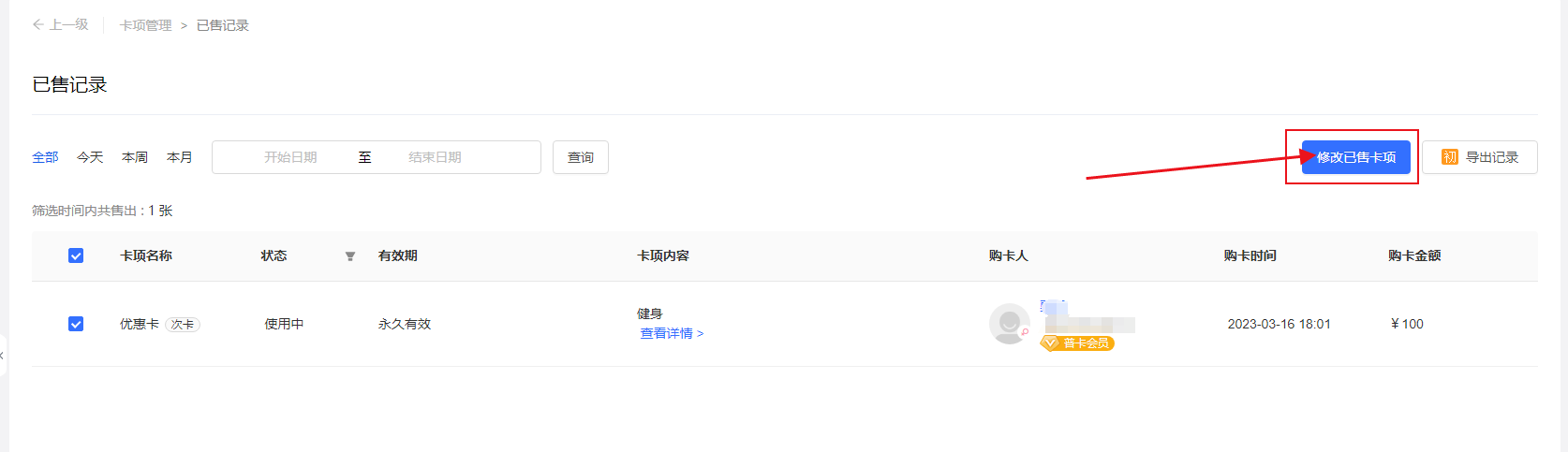 进入【已售记录】界面,可选择单个或批量选择会员,修改已售卡项。
