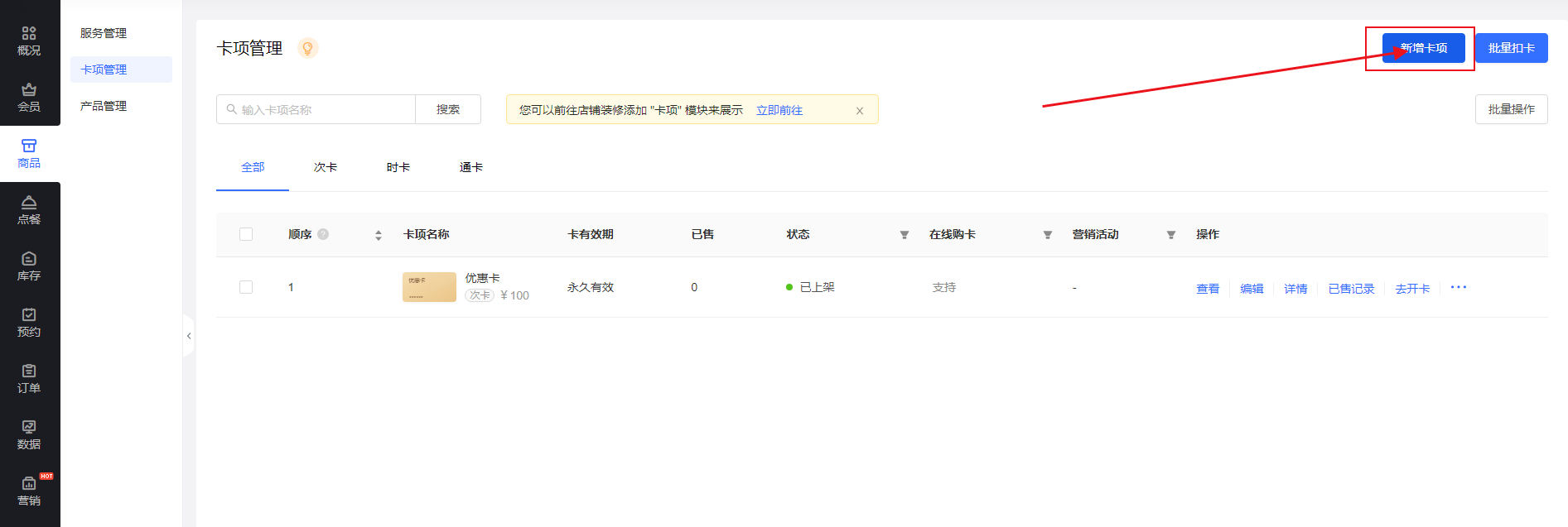 注:如果是多门店版,仅总部可新增卡项。