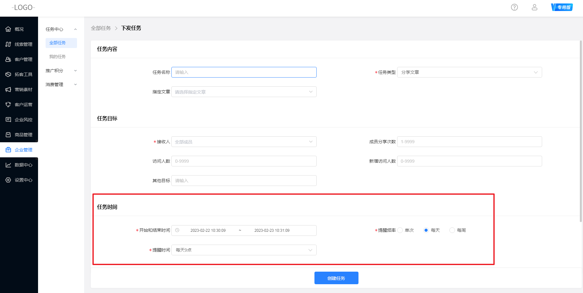 2.2 任务时间:管理员可设置任务的开始和结束时间、提醒销售员的频率和时间。
