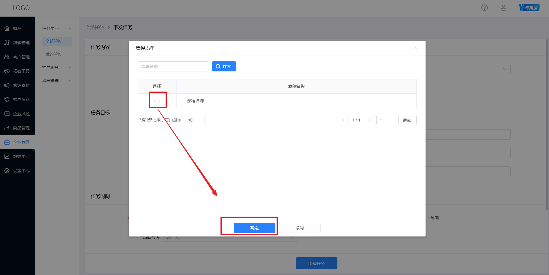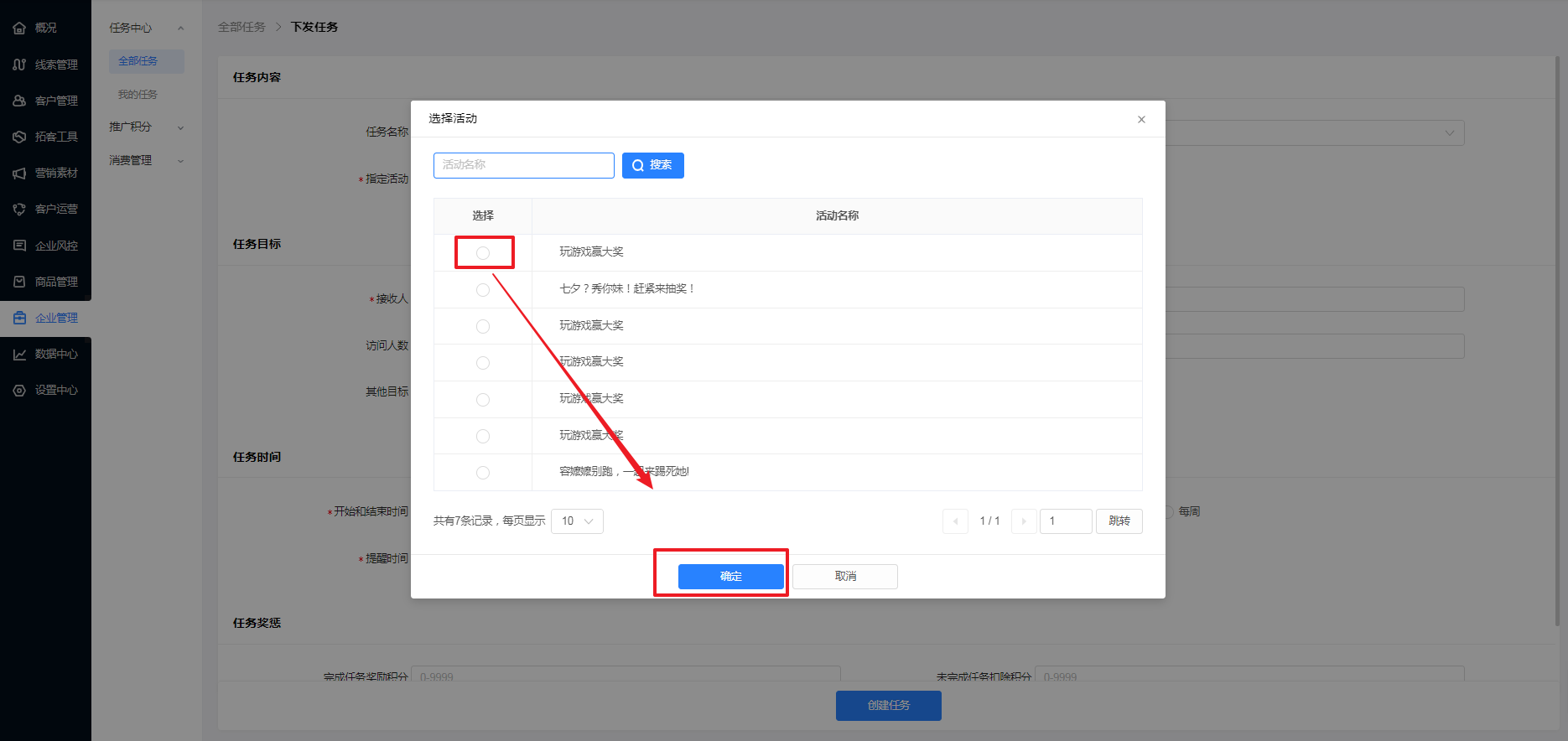 2.1 任务目标:管理员需要设置接收任务的销售员,点击对应销售员名字前的小方框后,点击“确认”后即可完成设定。若想取消选择某个销售员,点击左侧蓝色的方框或右侧面板中红色的叉即可。