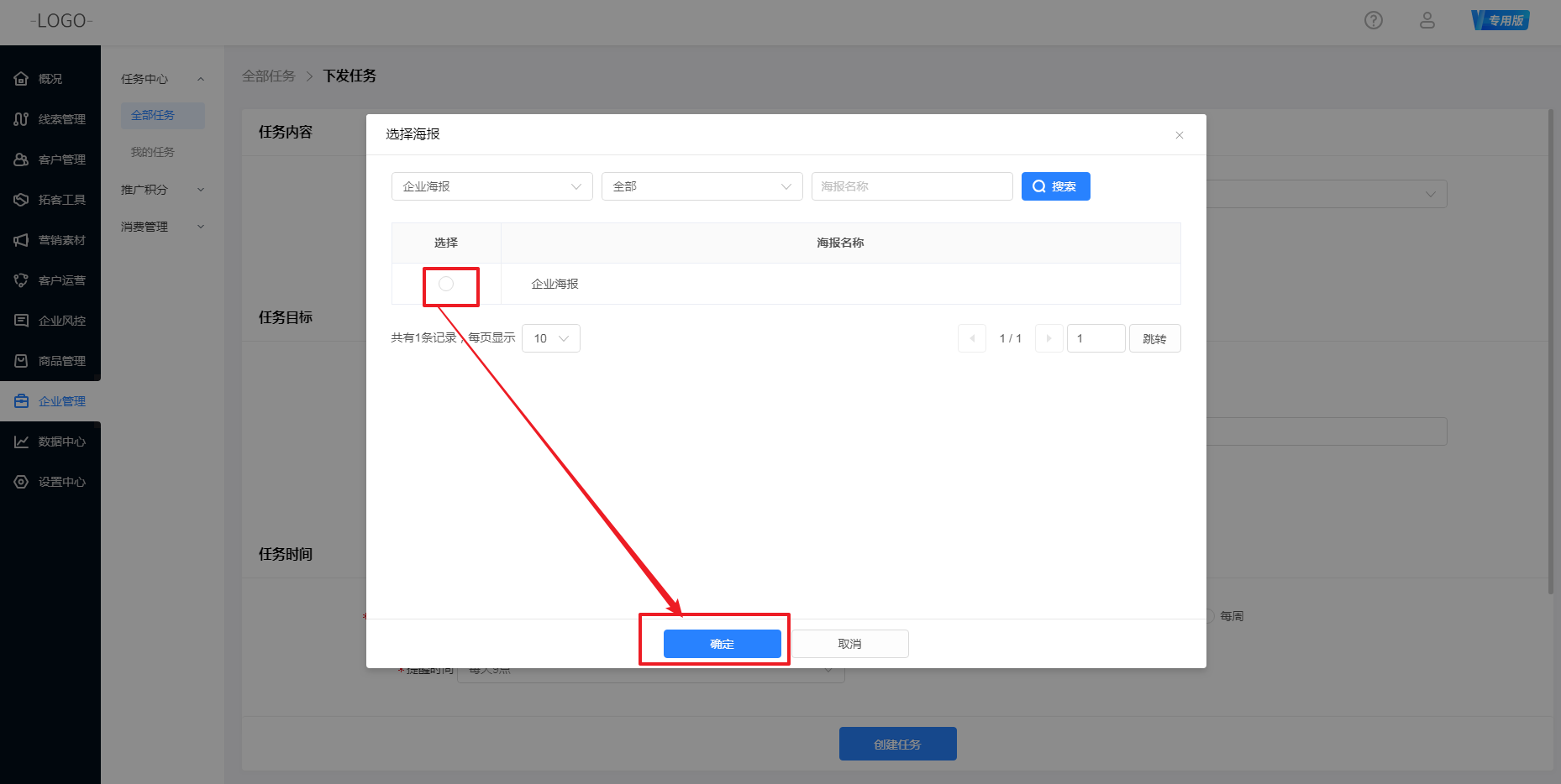 销售员可转发任意海报完成该项任务,若想让销售员分享特定海报,管理员可点击“指定海报”的下拉箭头进行选择,选择完成后,点击“确认”即可。