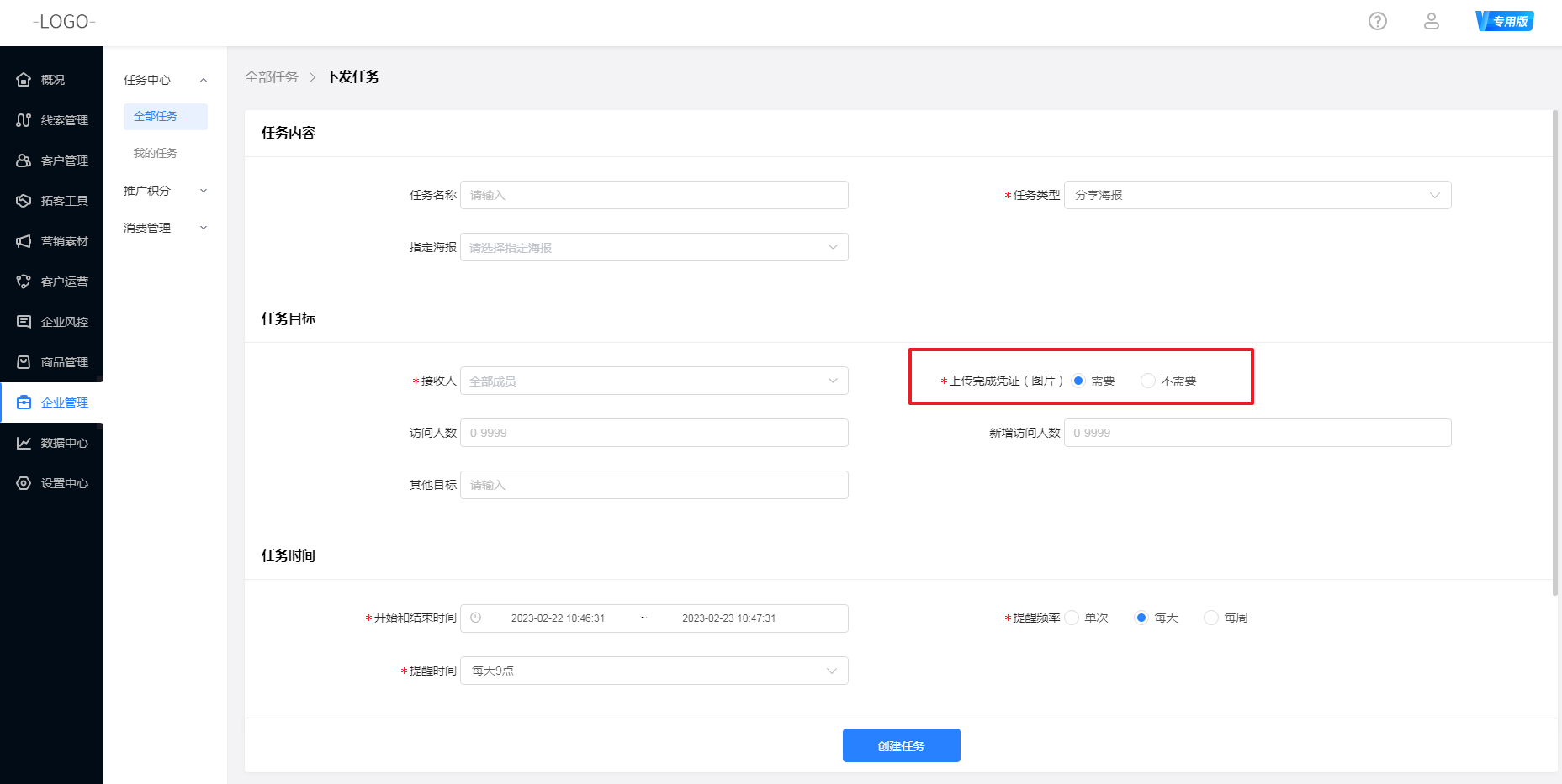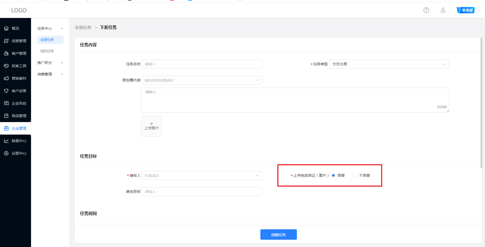 另外,管理员可在“任务目标”下设置是否需要上传完成凭证。