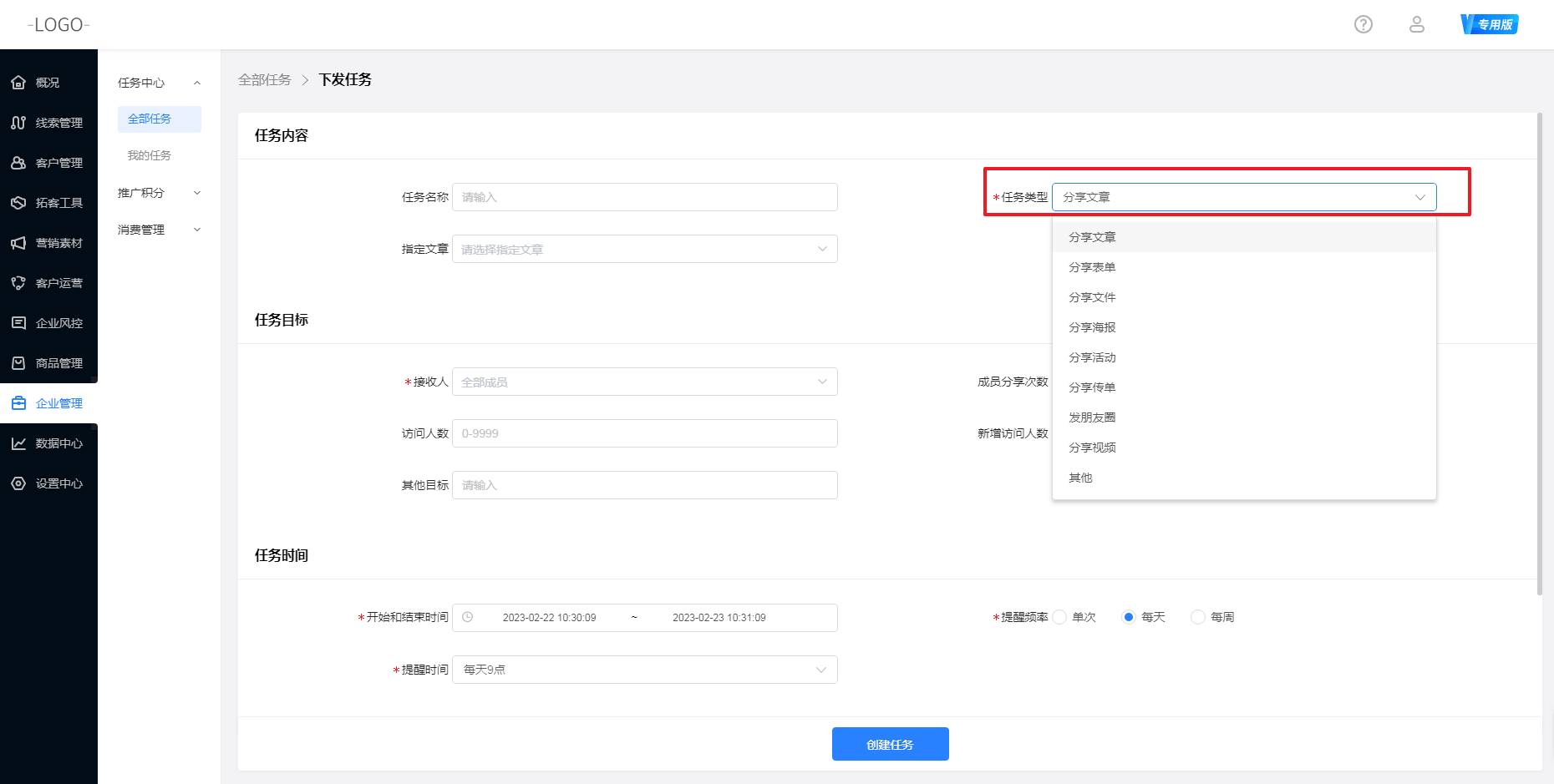 2.3 任务内容:管理员可自行设置任务名称,选择任务类型:分享文章、分享表单、分享海报、分享文件、分享活动、发朋友圈、其他。