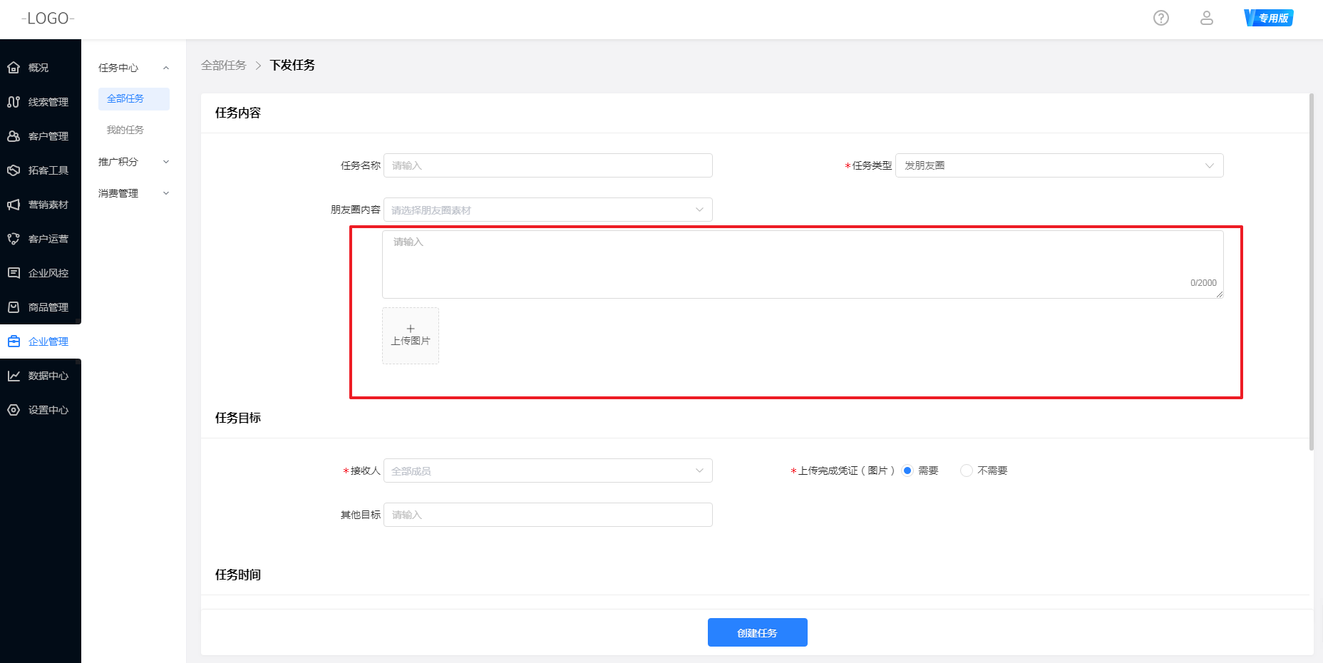 若选择发朋友圈任务,管理员可在设置朋友圈的文案和添加图片。
