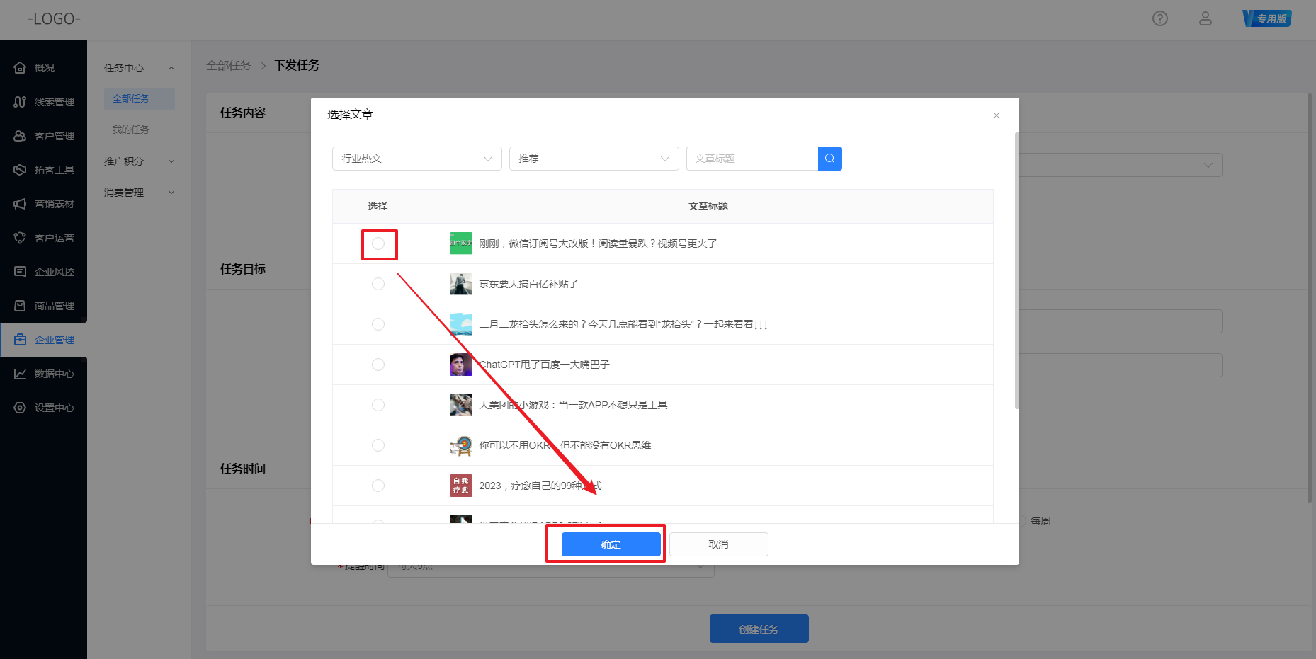 管理员可选择行业热闻/企业文库中一篇特定的文章让销售员进行分享,若不选择此项,则销售员可任意选择文章进行分享。