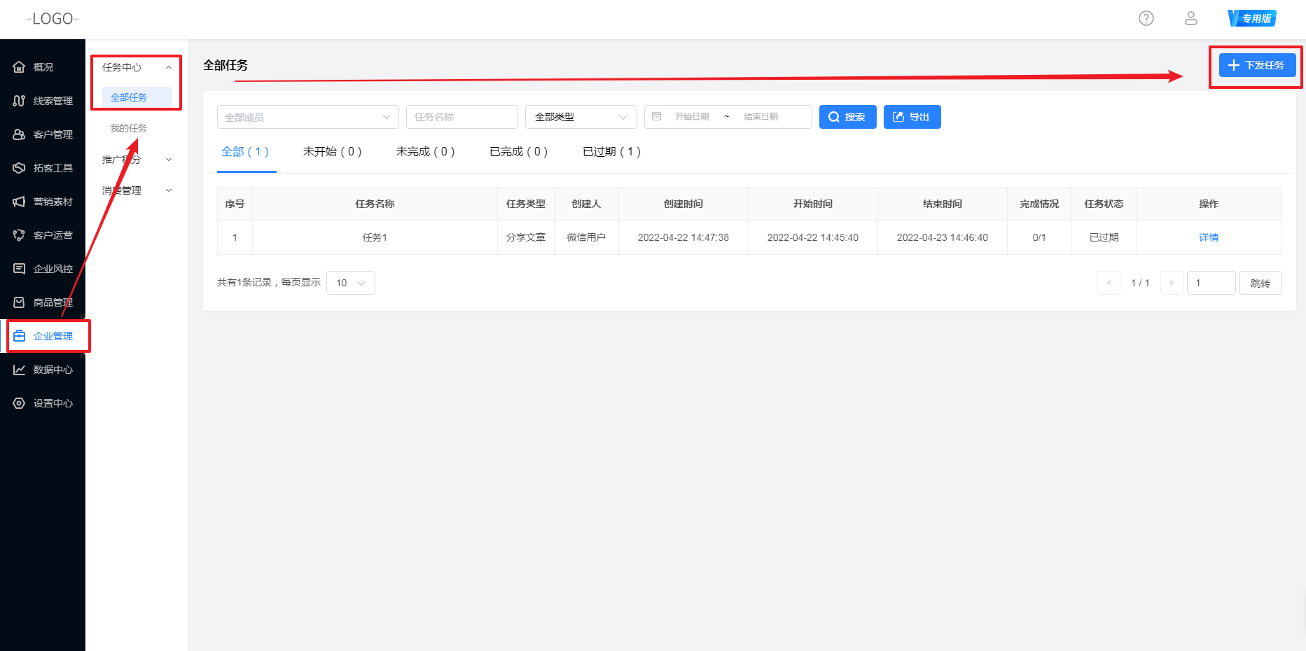 进入管理平台,登录您的账号,进入【企业管理—任务中心—全部任务】,点击右侧面板的“下发任务”。