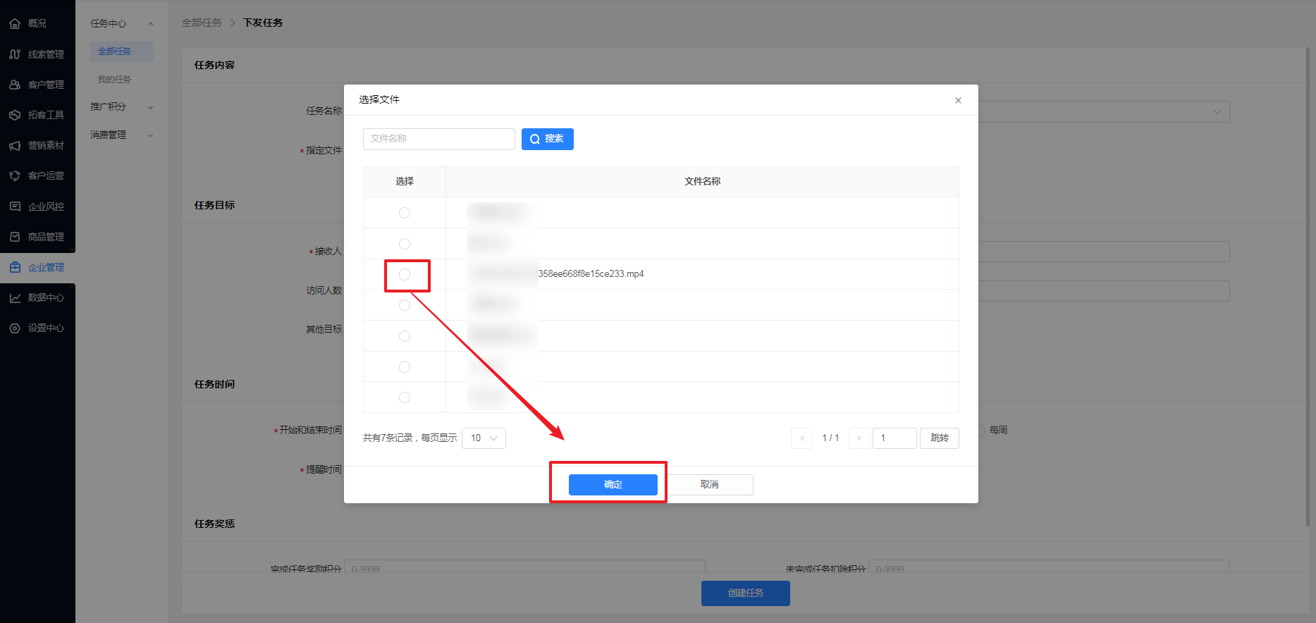 若管理员选择分享文件任务,则须点击“指定文件”下拉箭头,勾选需要分享的文件,选择完成后,点击“确认”即可。
