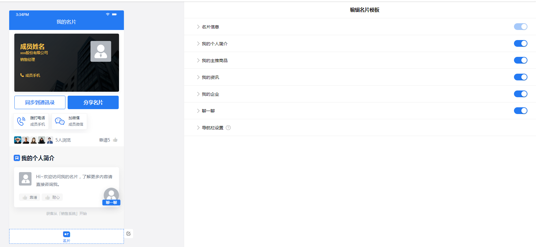 如果管理员对名片模块设置的是“显示”,则成员可以在【我的名片】中再自行设置显示与否。