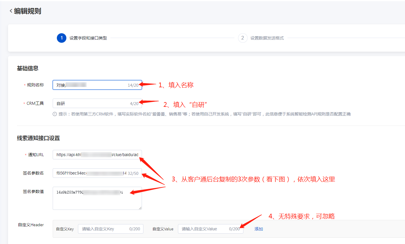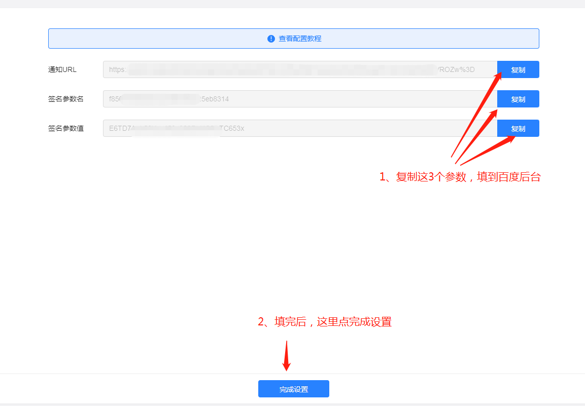 2. 输入规则名称,在销售系统后台复制三个参数,填写到对应的位置,点击【完成设置】