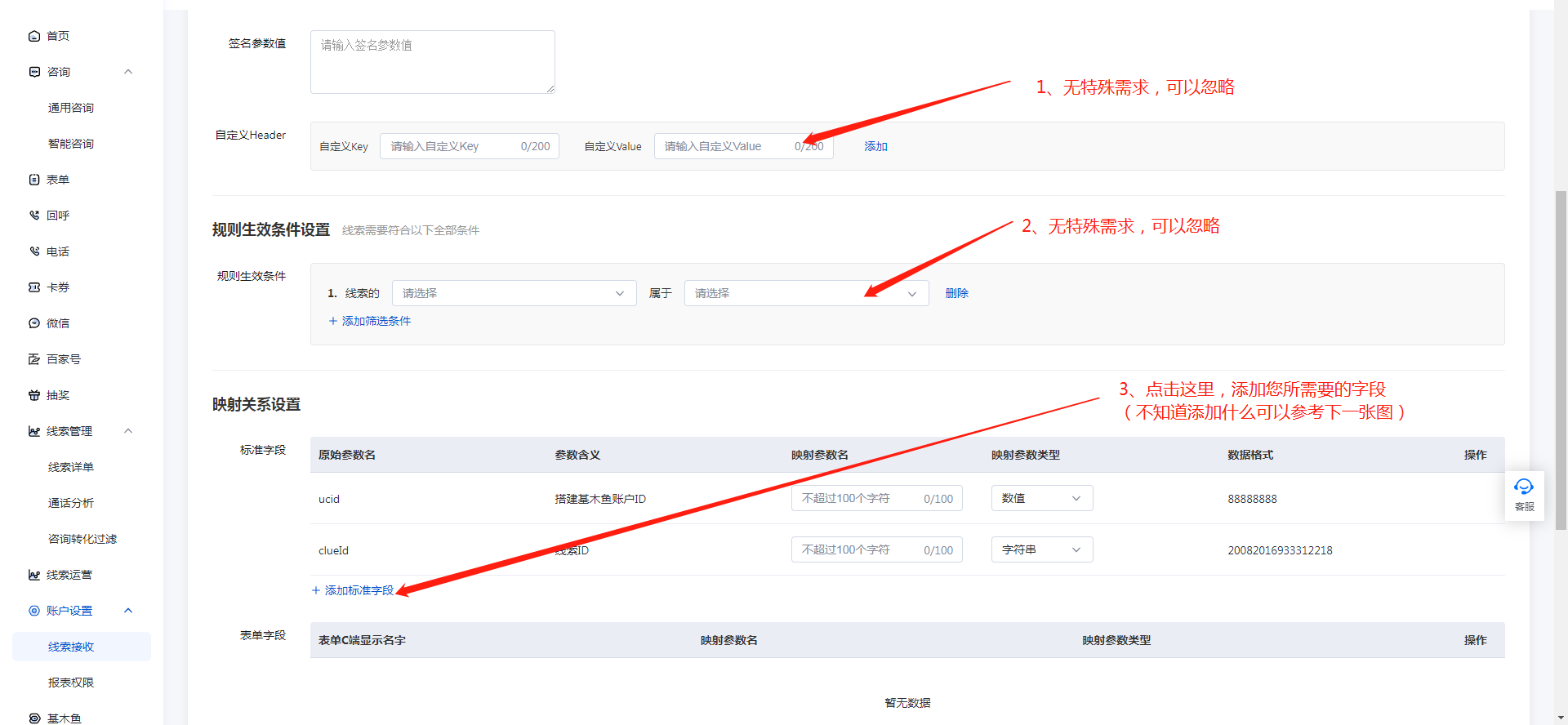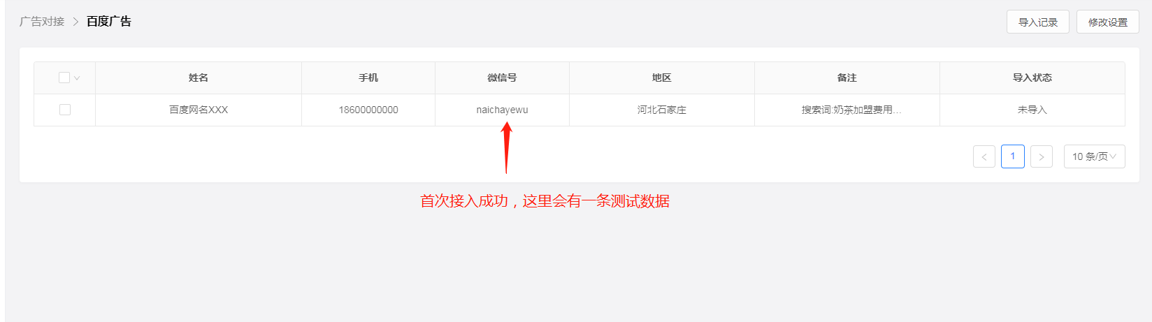 支持在百度广告平台投放获取到的线索,通过系统对接的方式自动实时导入到本系统,并由企业成员跟进转化。