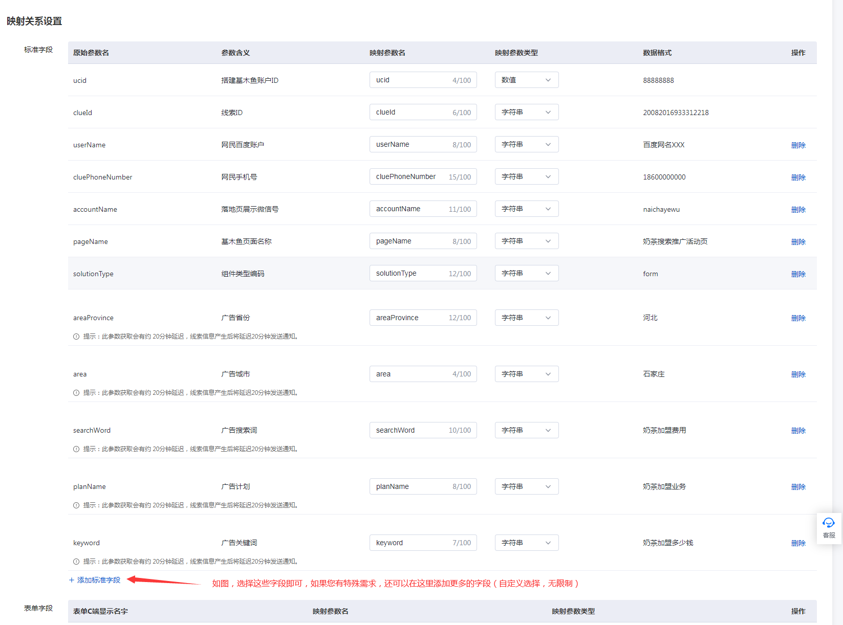 3. 如下图,选择对应的字段映射关系(除了图里的字段,您也可根据自己的需求新增其他字段),点击下一步