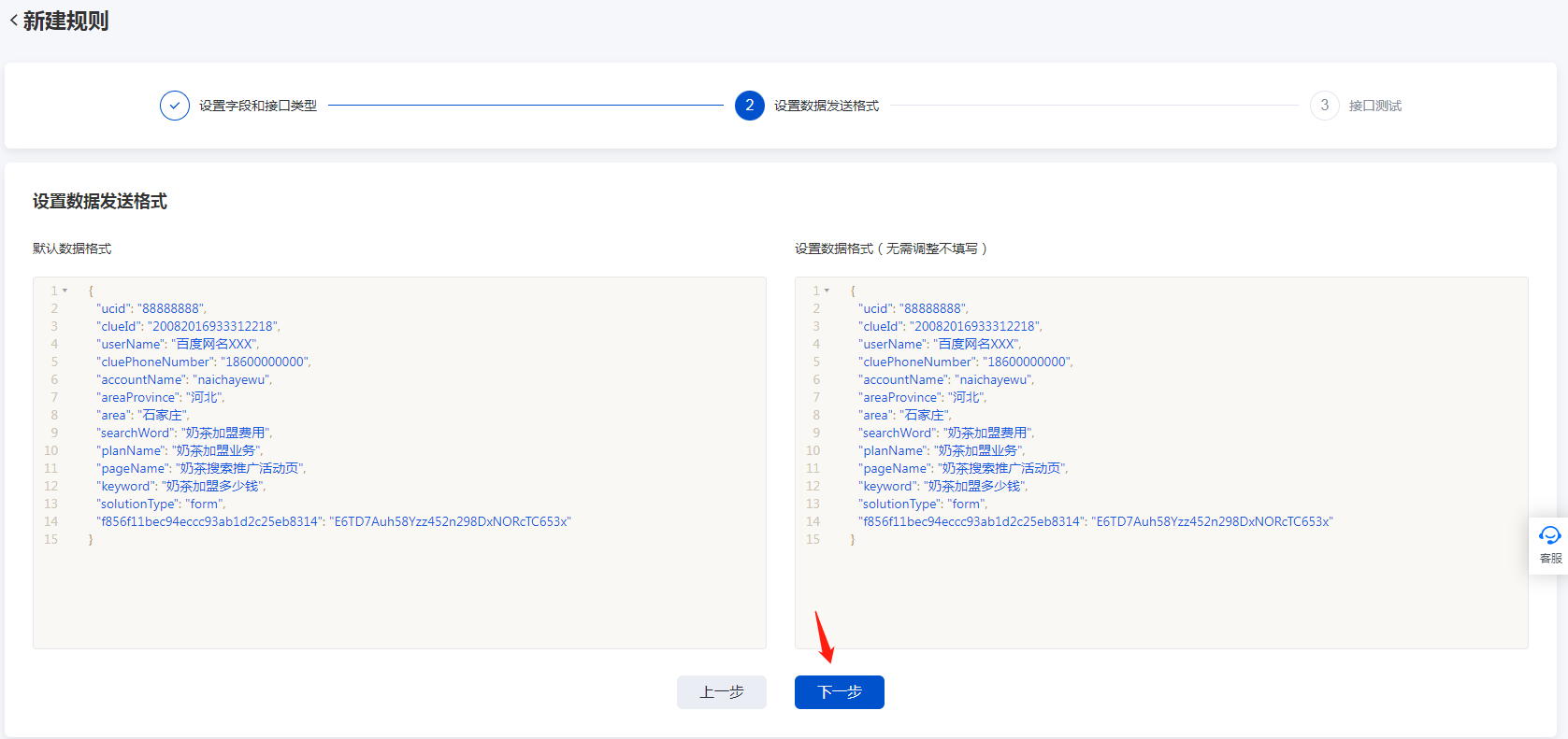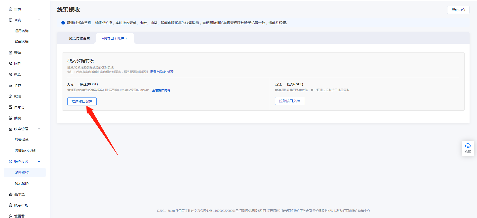 1. 登录【百度营销后台】,打开【账户设置】-【线索接收】-【API导出(账户)】 - 【方法一:推送(POST)】,点击【推送接口配置】-【新建规则】