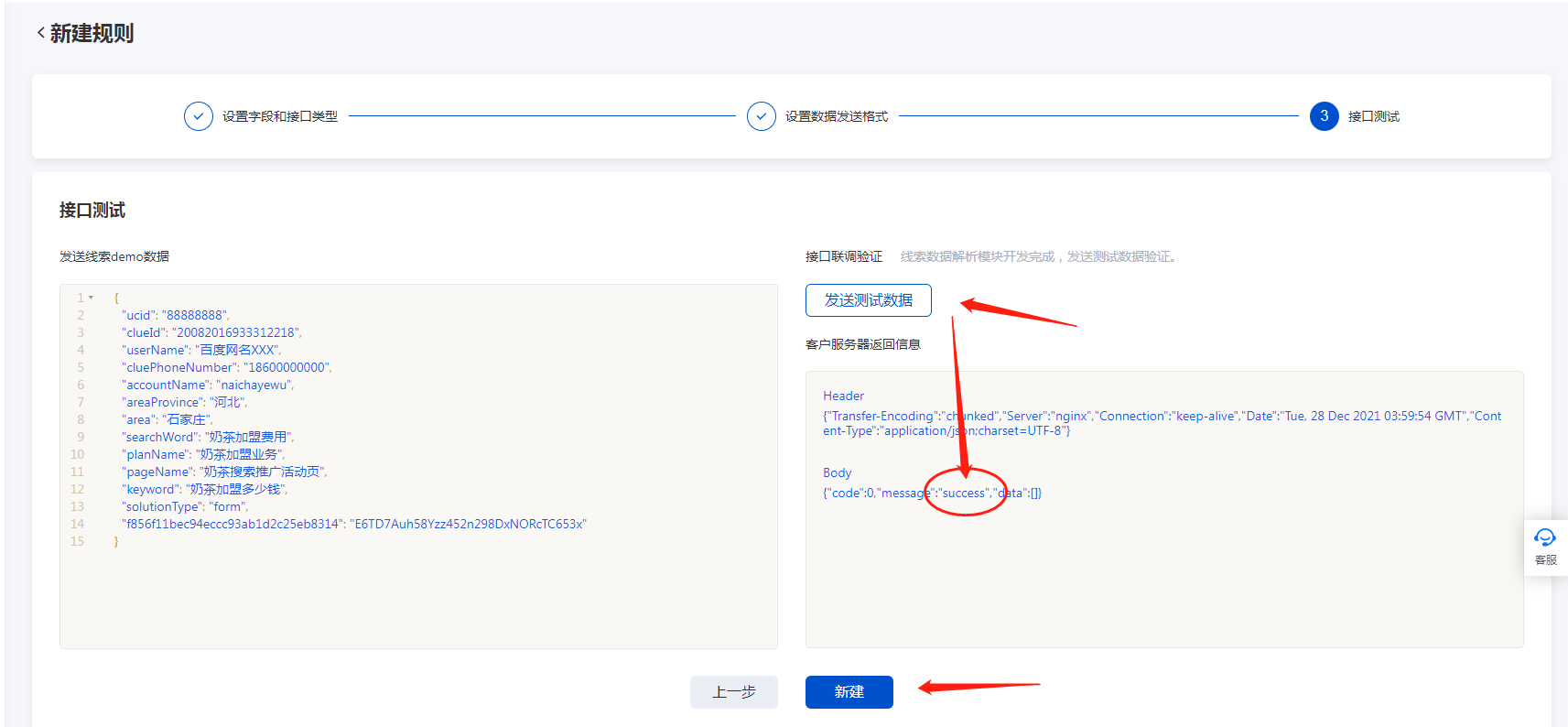 5. 点击【发送测试数据】,当显示“success”即可,再点击【新建】