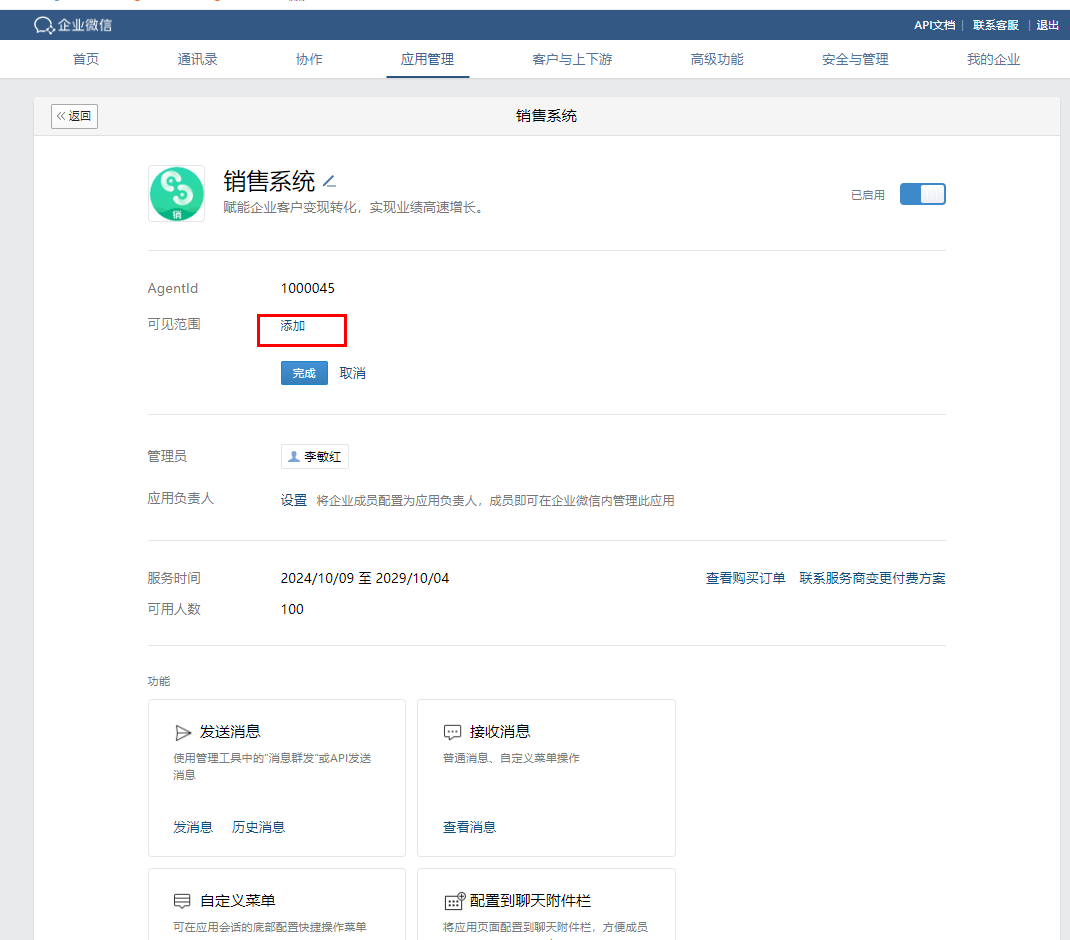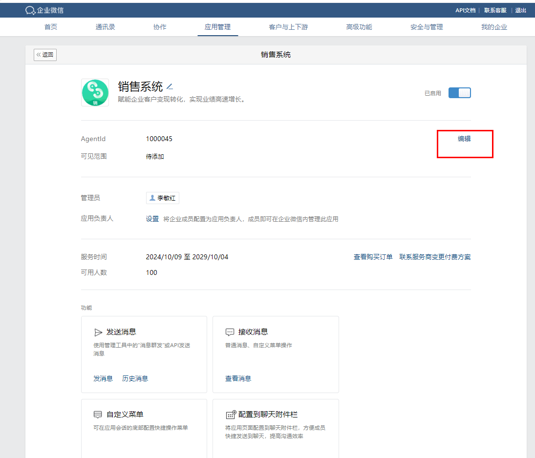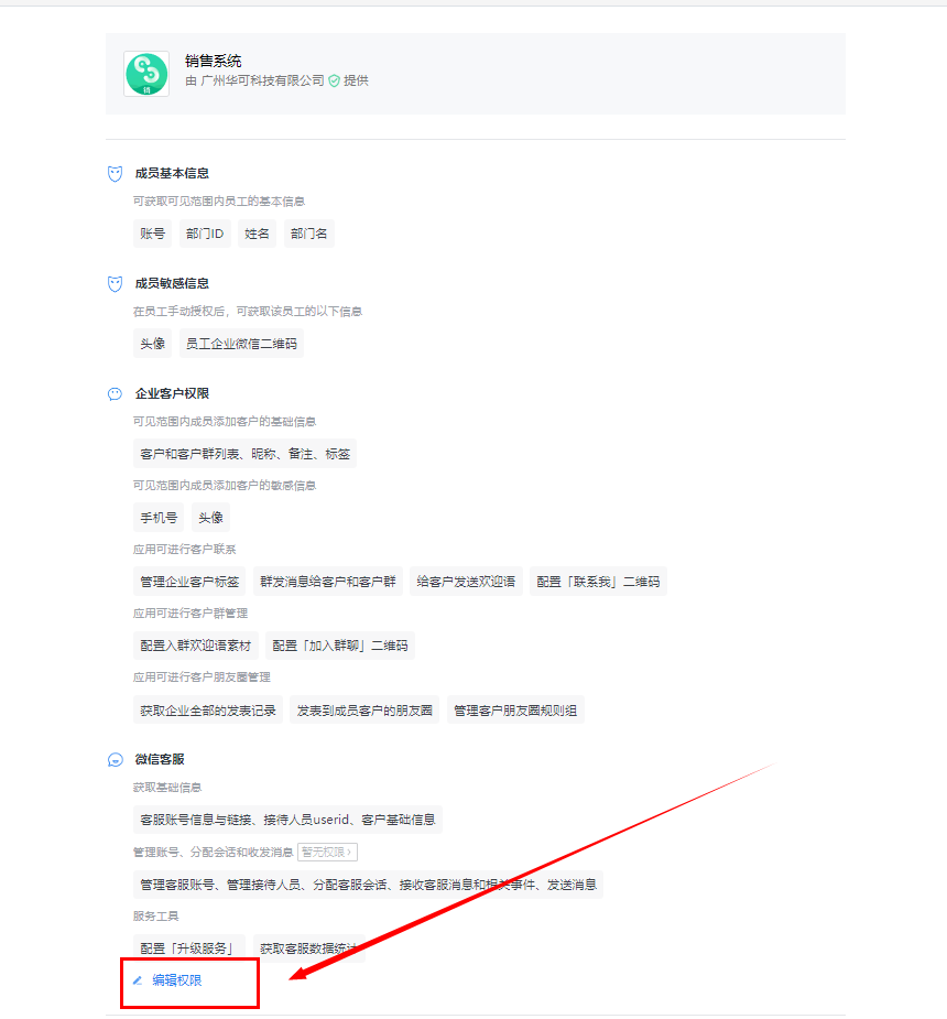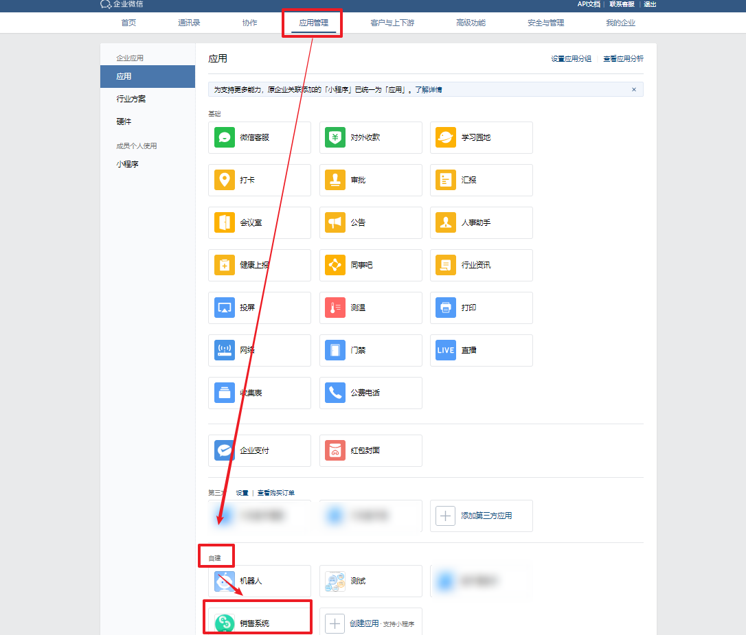 1. 登录【企业微信后台】,点击【应用管理】,找到【自建】,再找到【销售系统】,点击进入详情页