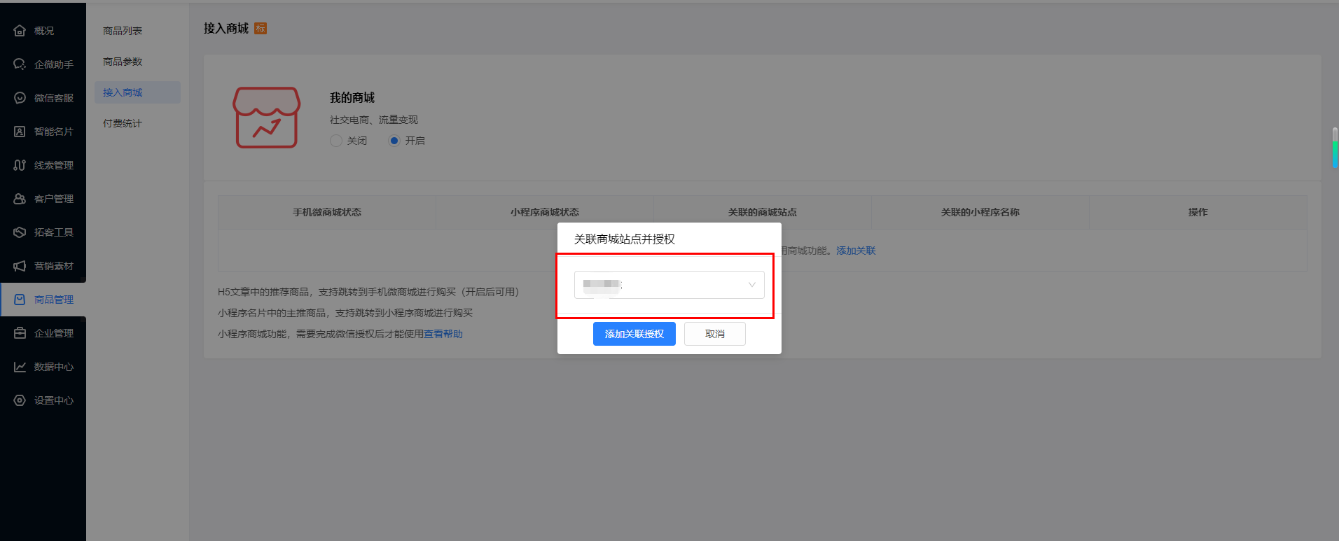1.2 选择要关联的商城站点,然后点击【添加关联授权】。