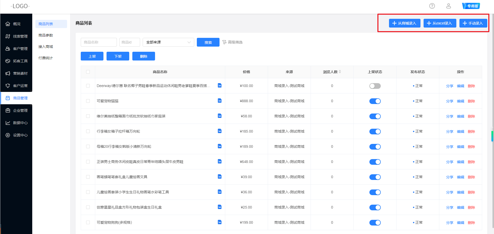 A:目前支持3种录入商品的方式:1.从商城录入;2.从销售系统PC端手动录入;3.通过excel批量录入。