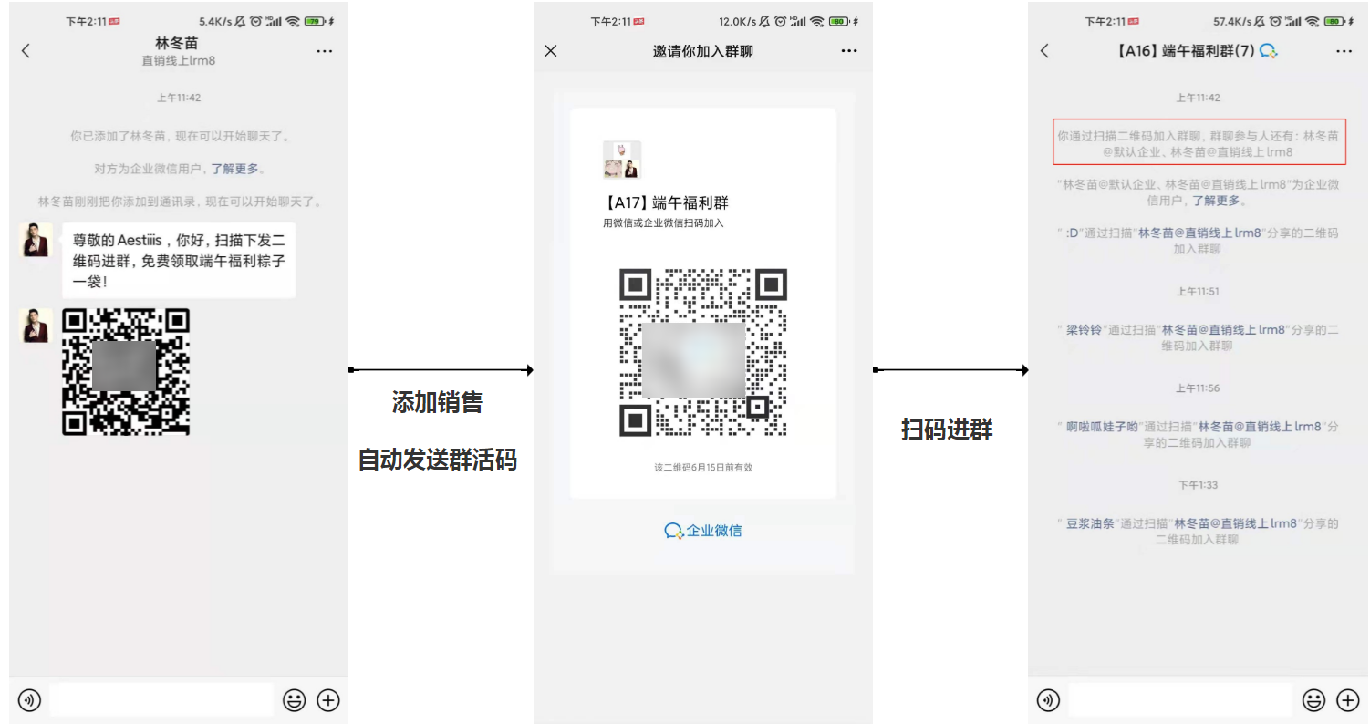 实现过程:客户先通过扫描二维码,添加销售成为好友,添加后,销售自动给客户发送1个群活码,引导客户扫码进群