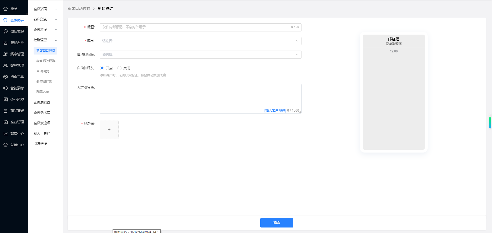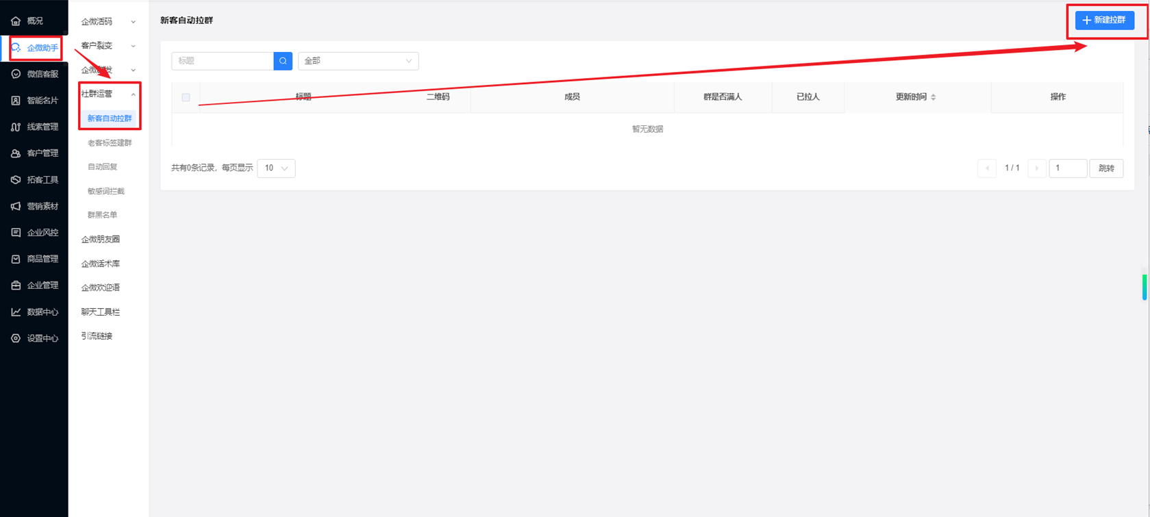 1.1 在管理后台【客户运营-社群运营-新客自动拉群】中点击【+新建拉群】。