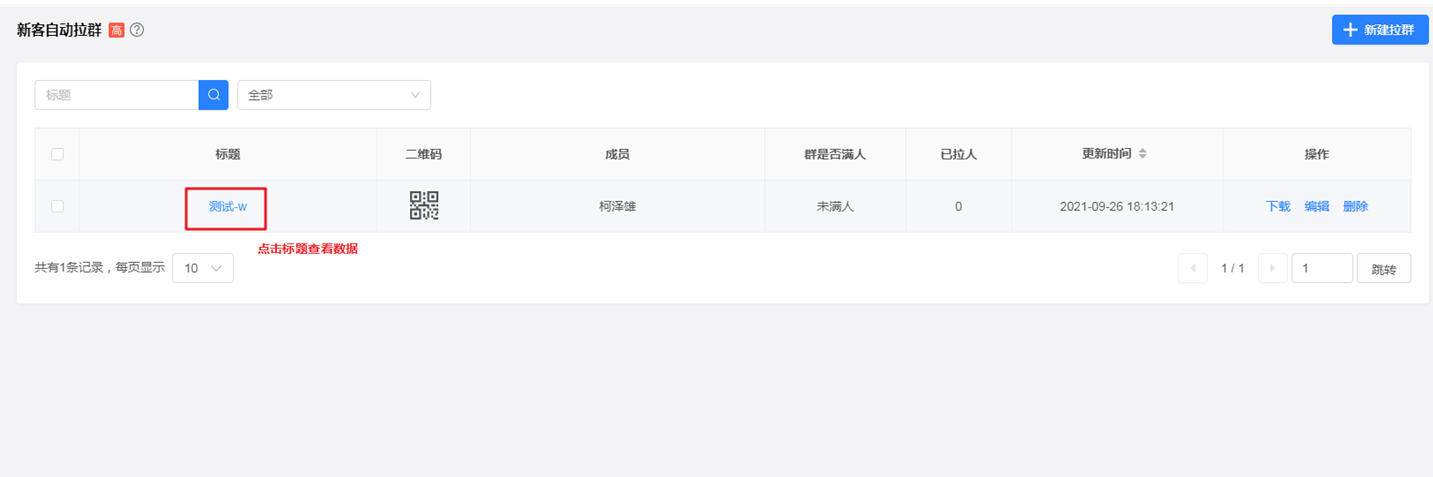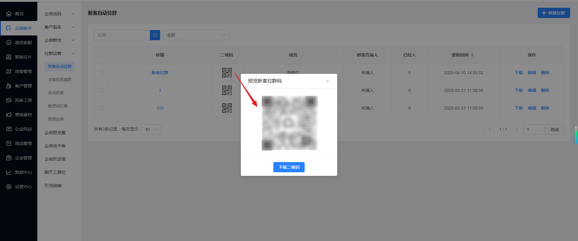 上个步骤已完成新建拉群,现在在【新客新建拉群】中下载新客拉群二维码。