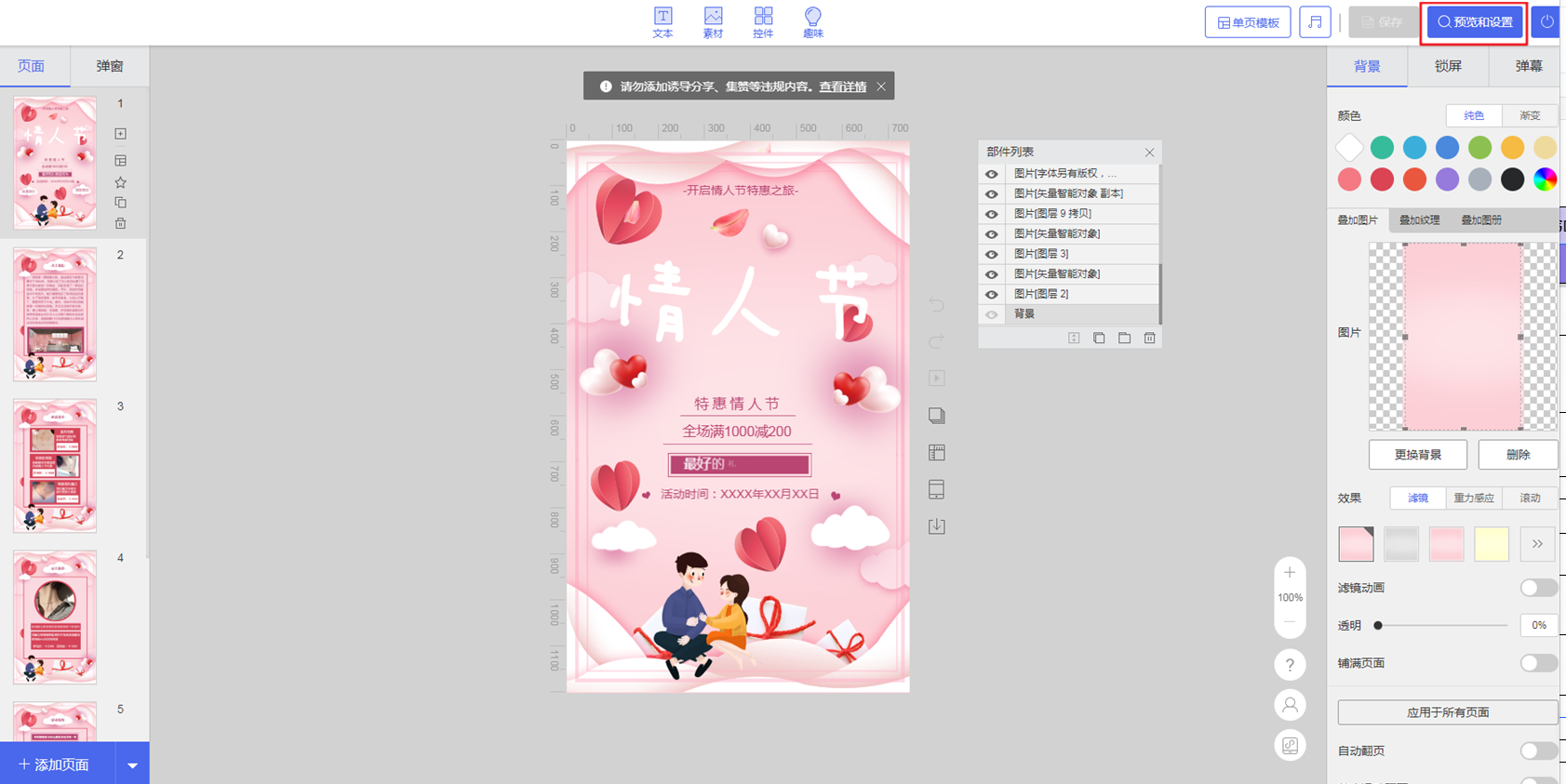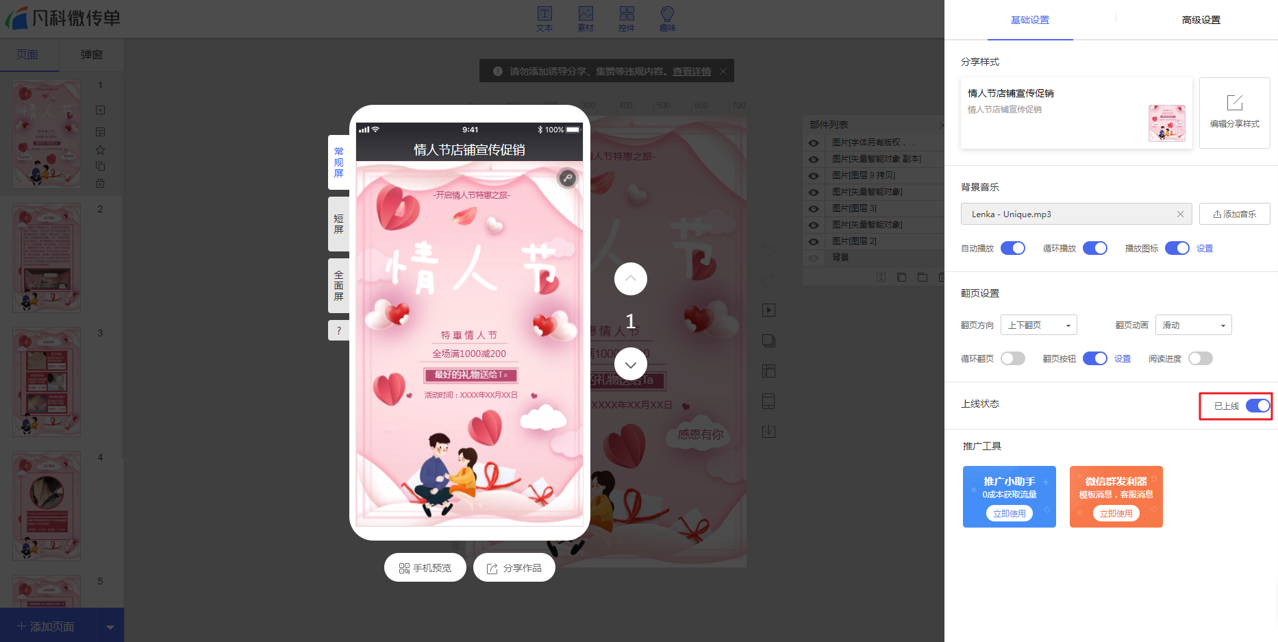 点击后对微传单进行基础和高级设置,例如背景音乐、翻页等设置。