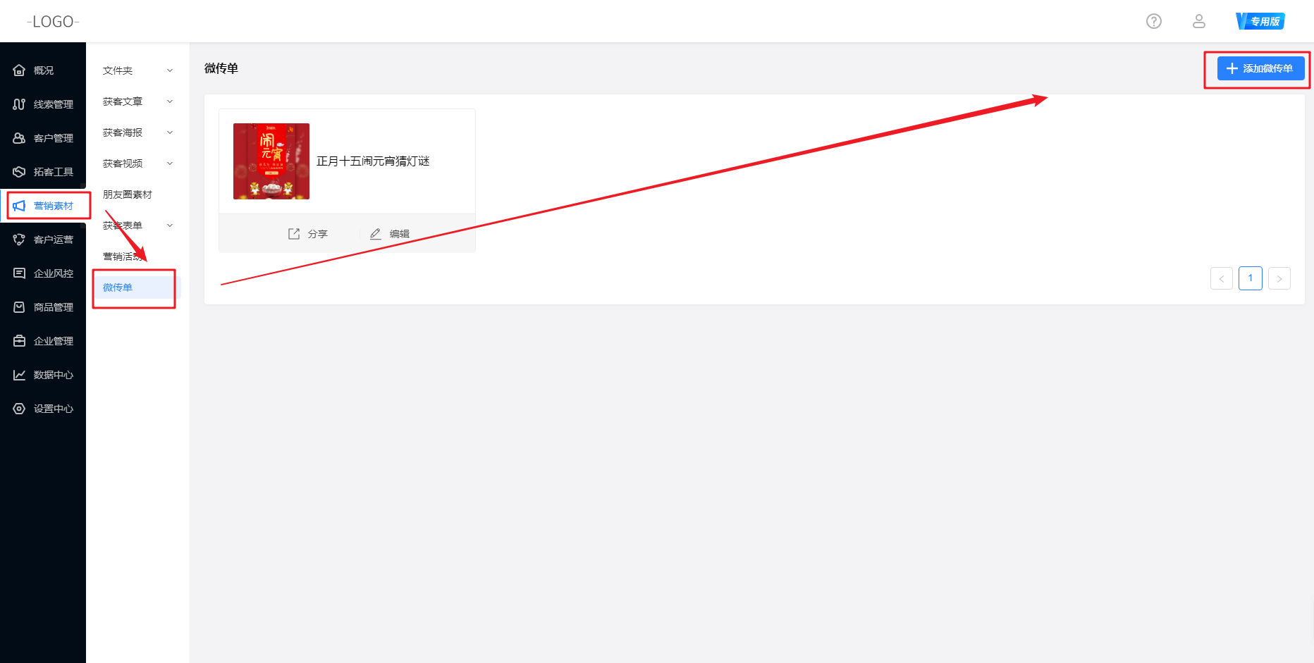① 在销售系统管理后台进入【营销素材-微传单】,点击右上角的【+创建微传单】跳转到微传单。