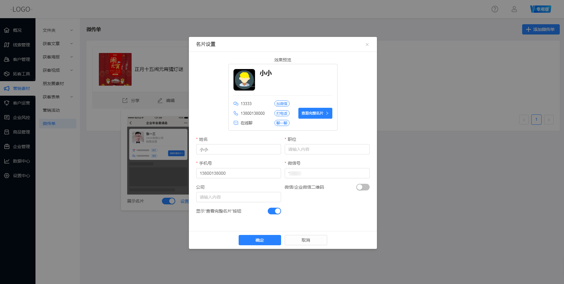 电脑端和小程序端接入微传单,管理员可以发起任务让成员转发微传单,有访客访问活动后将成为成员的线索客户。