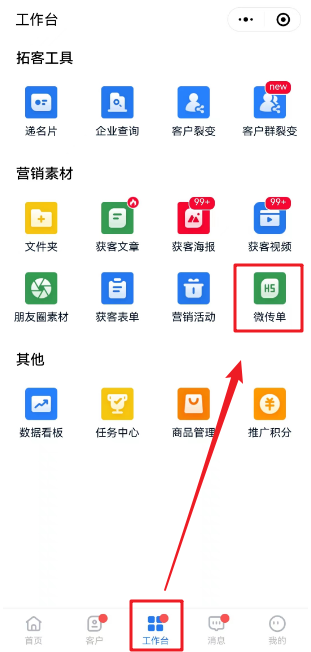① 进入销售系统小程序,在首页处点击“微传单”图标