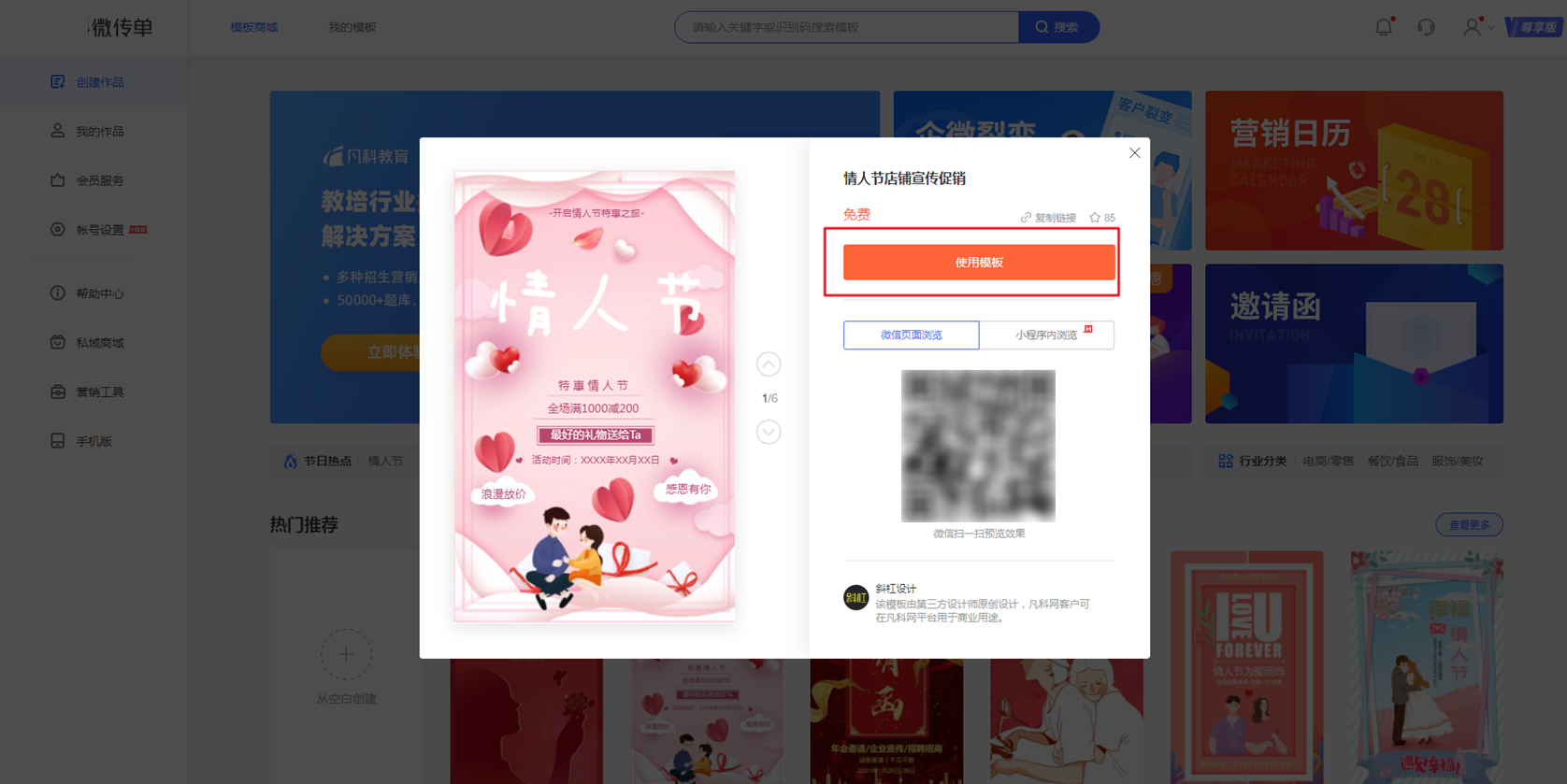 ③ 可以用手机扫描二维码先预览效果,预览后可点击“使用模板”对模板进行设置。
