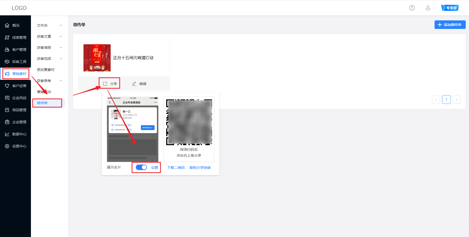进入销售系统管理后台,在【营销素材-微传单】中找到要分享的传单,点击【分享】。