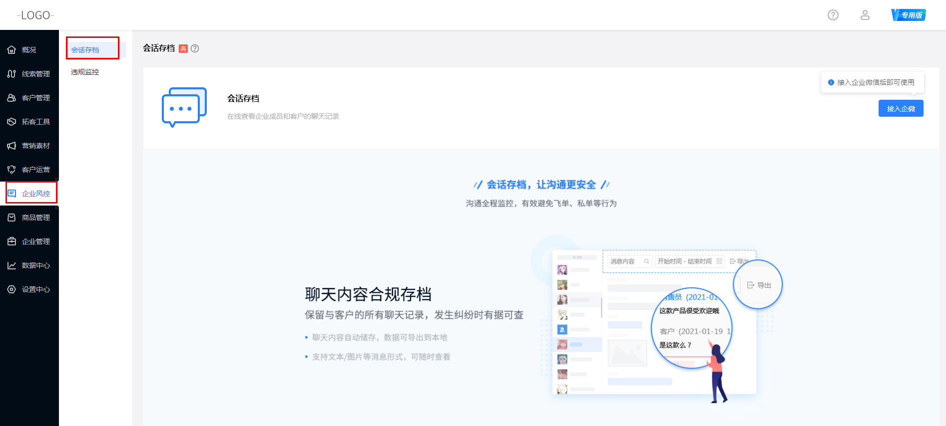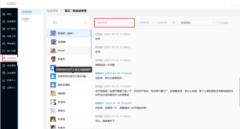 为了让企业管理者更好的管控企业成员与客户销售过程,销售系统增加了企微会话存档的会话质检功能。将未离职的员工与客户的文字、图片等聊天记录长期保存下来,一旦出现争议,可随时调取查看,保障企业和客户的相关利益。