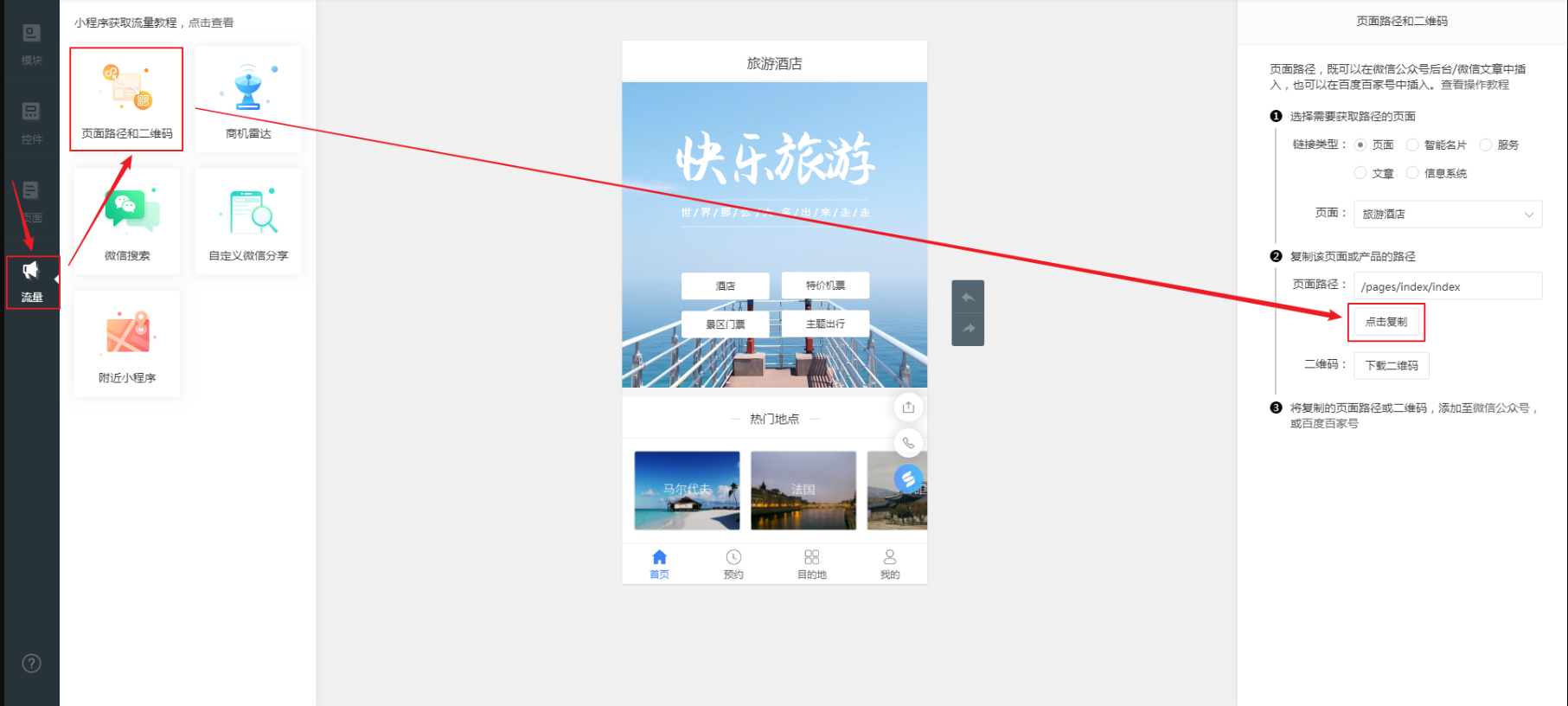 在后台管理平台登录您的账号,进入【轻应用小程序-设计小程序-流量-页面路径和二维码】,在右侧面板选择需要获取的路径的页面,下方会显示对应的页面路径,然后点击复制即可,如图。