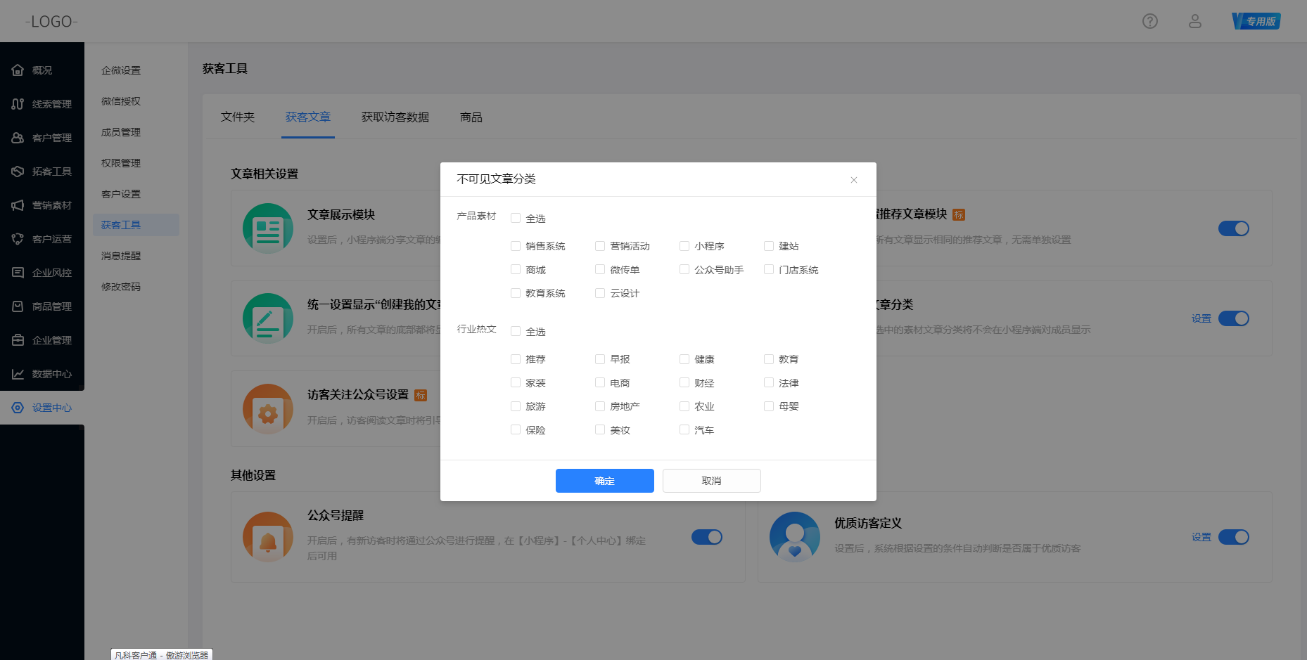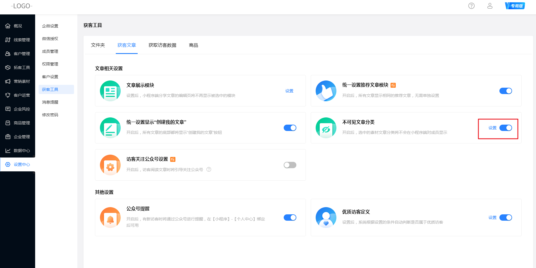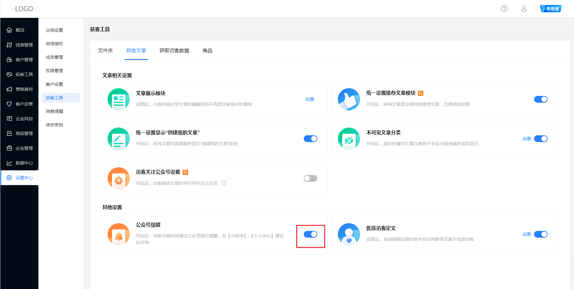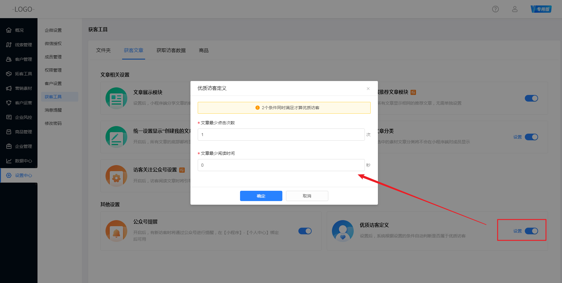 点击【设置中心】—【获客工具】,开启优质用户定义。