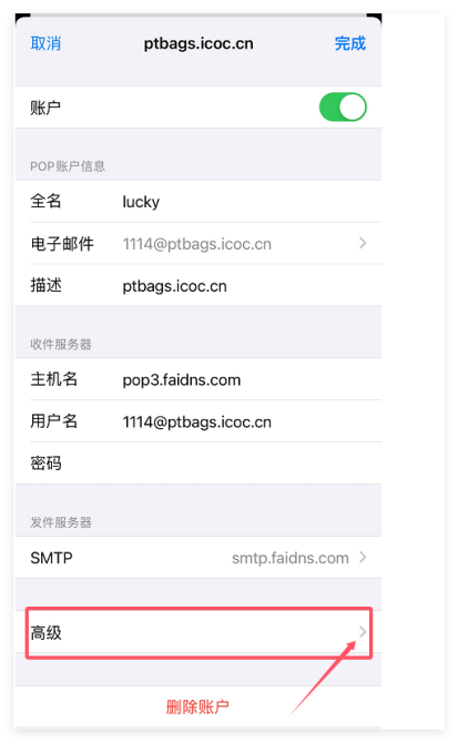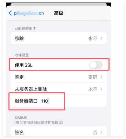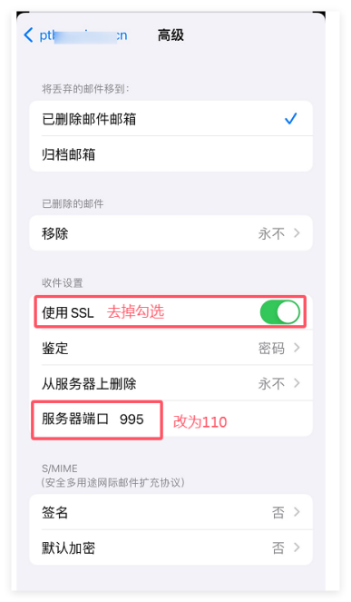7、设置好后点击【完成】,然后回到上一页,点击【高级】入口进入修改【收件设置】信息(使用ssl:去掉勾选,服务器端口改成110),修改后示例如图三。